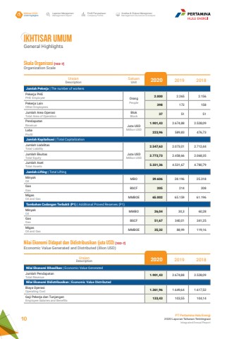 UraianDescriptionSatuanUnit 2020 2019 2018Jumlah Pekerja | The number of workersPekerja PHEPHE Employee OrangPeople2.000 2.265 2.156Pekerja LainOther Employees 398 172 158Jumlah Area OperasiTotal Area of OperationBlokBlock 37 51 51PendapatanRevenue Juta USDMillion USD1.901,43 2.674,88 2.528,09LabaProfit 223,96 589,83 476,73Jumlah Kapitalisasi | Total CapitalizationJumlah LiabilitasTotal LiabilityJuta USDMillion USD2.547,63 2.073,01 2.712,44 Jumlah EkuitasTotal Equity 2.773,73 2.458,66 2.068,35 Jumlah AsetTotal Assets 5.321,36 4.531,67 4.780,79 Jumlah Lifting | Total LiftingMinyakOil MBO 29.606 28.196 25.318GasGas BSCF 205 214 208MigasOil and Gas MMBOE 65.002 65.159 61.196 Tambahan Cadangan Terbukti (P1) | Additional Proved Reserves (P1)MinyakOil MMBO 26,04 30,3 60,28GasGas BSCF 51,67 340,01 341,25MigasOil and Gas MMBOE 35,32 88,99 119,16UraianDescription 2020 2019 2018Nilai Ekonomi Dihasilkan | Economic Value GeneratedJumlah PendapatanTotal Revenue 1.901,43 2.674,88 2.528,09Nilai Ekonomi Didistribusikan | Economic Value DistributedBiaya OperasiOperating Cost 1.361,96 1.649,64 1.617,52Gaji Pekerja dan TunjanganEmployee Salaries and Benefits 133,43 103,55 104,14Laporan ManajemenManagement ReportProfil PerusahaanCompany ProfileAnalisa & Diskusi ManajemenManagement Discussion & AnalysisIkhtisar 20202020 HighlightsPT Pertamina Hulu Energi2020 Laporan Tahunan TerintegrasiIntegrated Annual Report 10Skala Organisasi [102-7]Organization ScaleNilai Ekonomi Didapat dan Didistribusikan (juta USD) [102-7]Economic Value Generated and Distributed (illion USD)IKHTISAR UMUMGeneral Highlights