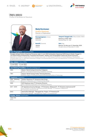 Medy KurniawanDirektur EksplorasiDirector of ExplorationKewarganegaraan | CitizenUsia | AgeTempat & Tanggal Lahir | Place & Date of BirthDomisili | DomicileIndonesiaIndonesiaBerusia, 52 tahun per 31 Desember 2020 52 years old as of December 31, 2020Bandung, 25 Mei 1968Bandung, May 25, 1968JakartaJakartaDasar Pengangkatan | Appointment BasisDiangkat sebagai Direktur Eksplorasi Perseroan sejak 13 Juni 2020 berdasarkan Keputusan RUPS Secara Sirkuler Tanggal 13 Juni 2020 tentang Pemberhentian, Perubahan Nomenklatur Jabatan serta Pengangkatan Direksi dan Dewan Komisaris.Appointed as a Director of Exploration of the Company since June 13, 2020 based on Decision of General Meeting of Shareholders Circularly dated June 13, 2020 about Dismissal, Changes in the Nomenclature of Position and Appointment of the Board of Directors and the Board of Commissioners.Masa Jabatan | Term of Office13 Juni 2020 %u2013 12 Juni 2023 June 13, 2020 %u2013 June 12, 2023Latar Belakang Pendidikan | Educational Background2003 Master Teknik Geologi Universitas Padjajaran Master of Geological Engineering, Padjadjaran University1991 Sarjana Teknik Geologi Institut Teknologi BandungBachelor Degree of Geological Engineering, Bandung Institute of TechnologyPengalaman | Experience2020 - Sekarang PresentDirektur Eksplorasi PT Pertamina Hulu Energi Director of Exploration at PT Pertamina Hulu Energi2020 SVP Eksplorasi Hulu PT Pertamina (Persero)SVP of Upstream Exploration of PT Pertamina (Persero)2017 - 2019 VP Operations/Country Manager - PT Pertamina Malaysia EP - PT Pertamina Internasional EPVice President of Operation Operations/Country Manager - PT Pertamina Malaysia EP - PT Pertamina Internasional EP2015 Sub Surface Manager - Pakugajah Dev. Project - PT Pertamina EP Sub Surface Manager - Pakugajah Dev. Project - PT Pertamina EP Rangkap Jabatan | Dual PositionTidak AdaNoneProfil DireksiProfile of the Board of DirectorsLaporan ManajemenManagement ReportProfil PerusahaanCompany ProfileAnalisa & Diskusi ManajemenManagement Discussion & AnalysisIkhtisar 20202020 HighlightsPT Pertamina Hulu Energi2020 Laporan Tahunan TerintegrasiIntegrated Annual Report 104