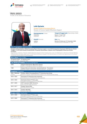 Lelin EpriantoDirektur SDM & Penunjang BisnisDirector of Human Capital & Business SupportKewarganegaraan | CitizenUsia | AgeTempat & Tanggal Lahir | Place & Date of BirthDomisili | DomicileIndonesiaIndonesiaBerusia, 53 tahun per 31 Desember 2020 53 years old as of December 31, 2020Ngawi, 21 April 1967Ngawi, April 21, 1967JakartaJakartaDasar Pengangkatan | Appointment BasisDiangkat sebagai Direktur SDM & Penunjang Bisnis Perseroan sejak 13 Juni 2020 berdasarkan Keputusan RUPS Secara Sirkuler Tanggal 13 Juni 2020 tentang Pemberhentian, Perubahan Nomenklatur Jabatan serta Pengangkatan Direksi dan Dewan Komisaris.Appointed as a Director of Human Capital & Business Support of the Company since June 13, 2020 based on Decision of General Meeting of Shareholders Circularly dated June 13, 2020 about Dismissal, Changes in the Nomenclature of Position and Appointment of the Board of Directors and the Board of Commissioners.Masa Jabatan | Term of Office23 Agustus 2020 %u2013 22 Agustus 2023 August 23, 2020 %u2013 August 22, 2023Latar Belakang Pendidikan | Educational Background2000 Magister Manajemen IBBI (STIE Jakarta)Master of Management IBBI (STIE Jakarta)1989 Sarjana Ekonomi Universitas Jenderal Sudirman - PurwokertoBachelor Degree of Economics Jenderal Sudirman - PurwekertoPengalaman | Experience2020 - Sekarang PresentDirektur SDM & Penunjang Bisnis PT Pertamina Hulu EnergiDirector of Human Capital & Business Support of PT Pertamina Hulu Energi2018 - 2020 Komisaris PT Pertamina Hulu IndonesiaCommissioners of PT Pertamina Hulu Indonesia2018 - 2020 Komisaris Utama PT Patra JasaPresident Commissioners of PT Patra Jasa2017 - 2020 SVP Corporate HSSE PertaminaSVP Corporate HSSE Pertamina2015 - 2017 Direktur Utama PDSI President Director of PDSI2014 - 2015 Direktur MD PDSIDirector of MD PDSIRangkap Jabatan | Dual Position2019 - 2020 Komisaris Utama PT Patra JasaPresident Commissioners of PT Patra Jasa2019 - 2020 Komisaris PT Pertamina Hulu IndonesiaCommissioners of PT Pertamina Hulu IndonesiaProfil DireksiProfile of the Board of DirectorsTata Kelola Perusahaan yang BaikGood Corporate GovernanceTanggung Jawab Sosial PerusahaanCorporate Social ResponsibilityLaporan Keuangan KonsolidasianConsolidated Financial ReportPT Pertamina Hulu Energi2020 Laporan Tahunan TerintegrasiIntegrated Annual Report 105