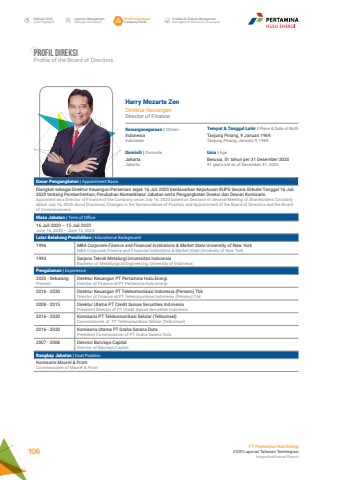 Harry Mozarta ZenDirektur KeuanganDirector of FinanceKewarganegaraan | CitizenUsia | AgeTempat & Tanggal Lahir | Place & Date of BirthDomisili | DomicileIndonesiaIndonesiaBerusia, 51 tahun per 31 Desember 2020 51 years old as of December 31, 2020Tanjung Pinang, 9 Januari 1969Tanjung Pinang, January 9, 1969JakartaJakartaDasar Pengangkatan | Appointment BasisDiangkat sebagai Direktur Keuangan Perseroan sejak 16 Juli 2020 berdasarkan Keputusan RUPS Secara Sirkuler Tanggal 16 Juli 2020 tentang Pemberhentian, Perubahan Nomenklatur Jabatan serta Pengangkatan Direksi dan Dewan Komisaris.Appointed as a Director of Finance of the Company since July 16, 2020 based on Decision of General Meeting of Shareholders Circularly dated July 16, 2020 about Dismissal, Changes in the Nomenclature of Position and Appointment of the Board of Directors and the Board of Commissioners.Masa Jabatan | Term of Office16 Juli 2020 %u2013 15 Juli 2023 June 16, 2020 %u2013 June 15, 2023Latar Belakang Pendidikan | Educational Background1996 MBA Corporate Finance and Financial Institutions & Market State University of New York MBA Corporate Finance and Financial Institutions & Market State University of New York1993 Sarjana Teknik Metalurgi Universitas IndonesiaBachelor of Metallurgical Engineering, University of IndonesiaPengalaman | Experience2020 - Sekarang PresentDirektur Keuangan PT Pertamina Hulu Energi Director of Finance at PT Pertamina Hulu Energi2016 - 2020 Direktur Keuangan PT Telekomunikasi Indonesia (Persero) TbkDirector of Finance at PT Telekomunikasi Indonesia (Persero) Tbk2008 - 2015 Direktur Utama PT Credit Suisse Securities IndonesiaPresident Director of PT Credit Suisse Securities Indonesia2016 - 2020 Komisaris PT Telekomunikasi Selular (Telkomsel)Commissioner of PT Telekomunikasi Selular (Telkomsel)2016 - 2020 Komisaris Utama PT Graha Sarana DutaPresident Commissioner of PT Graha Sarana Duta2007 - 2008 Director Barclays CapitalDirector of Barclays CapitalRangkap Jabatan | Dual PositionKomisaris Maurel & PromCommissioner of Maurel & PromProfil DireksiProfile of the Board of DirectorsLaporan ManajemenManagement ReportProfil PerusahaanCompany ProfileAnalisa & Diskusi ManajemenManagement Discussion & AnalysisIkhtisar 20202020 HighlightsPT Pertamina Hulu Energi2020 Laporan Tahunan TerintegrasiIntegrated Annual Report 106