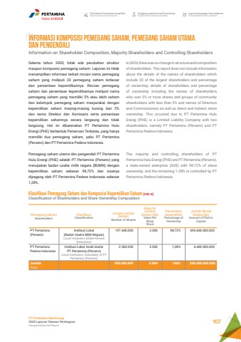 INFORMASI KOMPOSISI PEMEGANG SAHAM, PEMEGANG SAHAM UTAMA DAN PENGENDALIInformation on Shareholder Composition, Majority Shareholders and Controlling ShareholdersTata Kelola Perusahaan yang BaikGood Corporate GovernanceTanggung Jawab Sosial PerusahaanCorporate Social ResponsibilityLaporan Keuangan KonsolidasianConsolidated Financial ReportPT Pertamina Hulu Energi2020 Laporan Tahunan TerintegrasiIntegrated Annual Report 107Selama tahun 2020, tidak ada perubahan struktur maupun komposisi pemegang saham. Laporan ini tidak menampilkan informasi terkait rincian nama pemegang saham yang meliputi 20 pemegang saham terbesar dan persentase kepemilikannya. Rincian pemegang saham dan persentase kepemilikannya meliputi nama pemegang saham yang memiliki 5% atau lebih saham dan kelompok pemegang saham masyarakat dengan kepemilikan saham masing-masing kurang dari 5% dan nama Direktur dan Komisaris serta persentase kepemilikan sahamnya secara langsung dan tidak langsung. Hal ini dikarenakan PT Pertamina Hulu Energi (PHE) berbentuk Perseroan Terbatas, yang hanya memiliki dua pemegang saham, yaitu PT Pertamina (Persero) dan PT Pertamina Pedeve Indonesia. Pemegang saham utama dan pengendali PT Pertamina Hulu Energi (PHE) adalah PT Pertamina (Persero) yang merupakan badan usaha milik negara (BUMN) dengan kepemilikan saham sebesar 98,72% dan sisanya dipegang oleh PT Pertamina Pedeve Indonesia sebesar 1,28%.In 2020, there was no change in structure and composition of shareholders. This report does not include information about the details of the names of shareholders which include 20 of the largest shareholders and percentage of ownership, details of shareholders and percentage of ownership including the names of shareholders who own 5% or more shares and groups of community shareholders with less than 5% and names of Directors and Commissioners as well as direct and indirect share ownership. This occurred due to PT Pertamina Hulu Energi (PHE) is a Limited Liability Company with two shareholders, namely PT Pertamina (Persero) and PT Pertamina Pedeve Indonesia.The majority and controlling shareholders of PT Pertamina Hulu Energi (PHE) are PT Pertamina (Persero), a state-owned enterprise (SOE) with 98.72% of share ownership, and the remaining 1.28% is controlled by PT Pertamina Pedeve Indonesia.Pemegang SahamShareholdersKlasifikasiClassificationJumlah Lembar SahamNumber of SharesNilai Per LembarSaham (Rp)Value Per ShareStockPersentase Kepemilikan Percentage of OwnershipJumlah Modal Disetor(Rp)Amount of Paid-inCapitalPT Pertamina (Persero)Institusi Lokal (Badan Usaha Milik Negara)Local Institution (State-Owned Enterprise)197.440.000 2.500 98,72% 493.600.000.000PT Pertamina Pedeve IndonesiaInstitusi Lokal, Anak Usaha PT Pertamina (Persero)Local Institution, Subsidiary of PT Pertamina (Persero)2.560.000 2.500 1,28% 6.400.000.000JumlahTotal200.000.000 5.000 100% 500.000.000.000Klasifikasi Pemegang Saham dan Komposisi Kepemilikan Saham [102-5]Classification of Shareholders and Share Ownership Composition