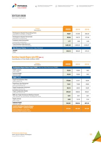 UraianDescription 2020 2019 2018Pendapatan Negara Bukan Pajak (PNBP) | Non-tax State Revenues (PNBP)PNBP LainnyaOther PNBP 55,54 92,84 34,5Subtotal PNBPSubtotal PNBP 55,54 92,84 34,5Pajak | TaxesPajak Pertambahan NilaiValue Added Tax 170,66 61,91 42,94Pajak Bumi dan BangunanLand and Building Tax 13,61 74,88 45,83Pajak Penghasilan KaryawanEmployee Income Tax 80,15 40,92 35,39Pajak Penghasilan BadanCorporate Income Tax 299,34 348,06 254,01BBN dan Pajak Kendaraan/Retribusi DaerahTitle Transfer Tax and Vehicle Tax/Regional Levies 0,01 0,01 0,01Pajak LainnyaOther Taxes 0,05 13,18 9,16Subtotal PajakSubtotal Taxes 563,82 538,96 387,34Jumlah Kontribusi Kepada Negara (Subtotal PNBP + Subtotal Pajak)Total Contribution to the State (Subtotal PNBP+Subtotal Taxes)619,36 631,80 421,84UraianDescription 2020 2019 2018Pembayaran Kepada Penyandang DanaPayments to Providers of Capital 98,87 212,95 202,32Pembayaran Kepada PemerintahPayments to Government 85,26 120,72 127,44Investasi untuk KomunitasCommunity Investments 1,77 2,04 2,09Total Distribusi Nilai EkonomiTotal Economic Value Distributed 1.681,29 2.089,39 2.053,97Nilai Ekonomi Ditahan | Economic Value RetainedJumlahTotal 220,15 585,49 474,12Tata Kelola Perusahaan yang BaikGood Corporate GovernanceTanggung Jawab Sosial PerusahaanCorporate Social ResponsibilityLaporan Keuangan KonsolidasianConsolidated Financial ReportPT Pertamina Hulu Energi2020 Laporan Tahunan TerintegrasiIntegrated Annual Report 11Kontribusi kepada Negara (juta USD) [201-1]Contribution of the State (million USD)Ikhtisar UmumGeneral Highlights