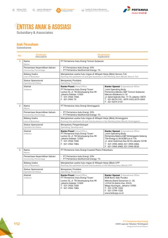 ENTITAS ANAK & ASOSIASISubsidiary & AssociatesNo DeskripsiDescriptionPenjelasanExplanation1 NamaNamePT Pertamina Hulu Energi Tomori SulawesiPersentase Kepemilikan SahamOwnership Percentage%u2022 PT Pertamina Hulu Energi: 99%%u2022 PT Pertamina Geothermal Energy: 1%Bidang UsahaLine of BusinessMenjalankan usaha hulu migas di Wilayah Kerja (Blok) Senoro ToliRunning the upstream oil and gas business in the Working Area (Block) Senoro ToliStatus OperasionalOperational StatusBeroperasi, ProduksiOperating, ProductionAlamatAddressKantor Pusat | Head OfficePT Pertamina Hulu Energi Tower Lantai 25, Jl. TB Simatupang Kav.99 Jakarta Selatan 12520 T : 021 2954 7000, F : 021 2952 70Kantor Operasi | Operational OfficeJoint Operating Body Pertamina Medco E&P Tomori Sulawesi Menara Bidakara Lt.18Jl. Gatot Subroto Kav. 71-73 Jakarta 12870T : 021 8379 3101, 8379 3102, 8379 3345F : 021 8379 31012 NamaNamePT Pertamina Hulu Energi SimenggarisPersentase Kepemilikan SahamOwnership Percentage%u2022 PT Pertamina Hulu Energi: 99%%u2022 PT Pertamina Geothermal Energy: 1%Bidang UsahaLine of BusinessMenjalankan usaha hulu migas di Wilayah Kerja (Blok) SimenggarisRunning the upstream Oil and Gas business in the Working Area (Block) SimenggarisStatus OperasionalOperational StatusBeroperasi, PengembanganOperating, DevelopmentAlamatAddressKantor Pusat | Head OfficePT Pertamina Hulu Energi Tower Lantai 25, Jl. TB Simatupang Kav.99 Jakarta Selatan 12520 T : 021 2954 7000F : 021 2952 7086Kantor Operasi | Operational OfficeJoint Operating Body Pertamina Medco E&P Simenggaris Gedung The Energy Lt.26 SCBD Lot A 11A Jl. Jend. Sudirman Kav.52-53 Jakarta 12190T : 021 2995 4000, 021 2995 4506F : 021 2995 4983, 021 2996 50303 NamaNamePT Pertamina Hulu Energi Coastal Plains PekanbaruPersentase Kepemilikan SahamOwnership Percentage%u2022 PT Pertamina Hulu Energi: 99%%u2022 PT Pertamina Geothermal Energy: 1%Bidang UsahaLine of BusinessMenjalankan usaha hulu migas di Wilayah Kerja (Blok) CPPRunning the upstream Oil and Gas business in the Working Area (Block) CPPStatus OperasionalOperational StatusBeroperasi, ProduksiOperating, ProductionAlamatAddressKantor Pusat | Head OfficePT Pertamina Hulu Energi Tower Lantai 25, Jl. TB Simatupang Kav.99 Jakarta Selatan 12520 T : 021 2954 7000F : 021 2952 7086Kantor Operasi | Operational OfficeBOB Bumi Siak Pusako Menara Bank Danamon Lt. 20, Jl.Prof.Dr.Satrio Kav. EIV/6 Mega Kuningan, Jakarta 12950T : 021 5799 1552 F : 021 5799 1553www.bobcpp.co.idLaporan ManajemenManagement ReportProfil PerusahaanCompany ProfileAnalisa & Diskusi ManajemenManagement Discussion & AnalysisIkhtisar 20202020 HighlightsPT Pertamina Hulu Energi2020 Laporan Tahunan TerintegrasiIntegrated Annual Report 112Anak PerusahaanSubsidiaries