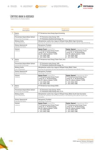 No DeskripsiDescriptionPenjelasanExplanation7 NamaNamePT Pertamina Hulu Energi Ogan KomeringPersentase Kepemilikan SahamOwnership Percentage%u2022 PT Pertamina Hulu Energi: 99%%u2022 PT Pertamina Geothermal Energy: 1%Bidang UsahaLine of BusinessMenjalankan usaha hulu migas di Wilayah Kerja (Blok) Ogan KomeringRunning the upstream Oil and Gas business in the Working Area (Block) Ogan KomeringStatus OperasionalOperational StatusBeroperasi, ProduksiOperating, ProductionAlamatAddressKantor Pusat | Head OfficePT Pertamina Hulu Energi Tower Lantai 25, Jl. TB Simatupang Kav.99 Jakarta Selatan 12520 T : 021 2954 7000F : 021 2952 7086Kantor Operasi | Operational OfficePT Pertamina Hulu Energi Tower Lantai 25, Jl. TB Simatupang Kav.99 Jakarta Selatan 12520 T : 021 2954 7000F : 021 2952 70868 NamaNamePT Pertamina Hulu Energi Tuban East JavaPersentase Kepemilikan SahamOwnership Percentage%u2022 PT Pertamina Hulu Energi: 99%%u2022 PT Pertamina Geothermal Energy: 1%Bidang UsahaLine of BusinessMenjalankan usaha hulu migas di Wilayah Kerja (Blok) TubanRunning the upstream Oil and Gas business in the Working Area (Block) TubanStatus OperasionalOperational StatusBeroperasi, ProduksiOperating, ProductionAlamatAddressKantor Pusat | Head OfficePT Pertamina Hulu Energi Tower Lantai 25, Jl. TB Simatupang Kav.99 Jakarta Selatan 12520 T : 021 2954 7000F : 021 2952 7086Kantor Operasi | Operational OfficePT Pertamina Hulu Energi Tower Lantai 25, Jl. TB Simatupang Kav.99 Jakarta Selatan 12520 T : 021 2954 7000F : 021 2952 70869 NamaNamePT Pertamina Hulu Energi OSESPersentase Kepemilikan SahamOwnership Percentage%u2022 PT Pertamina Hulu Energi: 99,9%%u2022 PT Pertamina Hulu Energi Arun: 0,1%Bidang UsahaLine of BusinessMenjalankan usaha hulu migas di Wilayah Kerja (Blok) South East SumateraRunning the upstream Oil and Gas business in the Working Area (Block) South East SumateraStatus OperasionalOperational StatusBeroperasi, ProduksiOperating, ProductionAlamatAddressKantor Pusat | Head OfficePT Pertamina Hulu Energi Tower Lantai 25, Jl. TB Simatupang Kav.99 Jakarta Selatan 12520 T : 021 2954 7000F : 021 2952 7086Kantor Operasi | Operational OfficePT Pertamina Hulu Energi Tower Lantai 25, Jl. TB Simatupang Kav.99 Jakarta Selatan 12520 T : 021 2954 7000F : 021 2952 7086Entitas anak & AsosiasiSubsidiary & AssociatesLaporan ManajemenManagement ReportProfil PerusahaanCompany ProfileAnalisa & Diskusi ManajemenManagement Discussion & AnalysisIkhtisar 20202020 HighlightsPT Pertamina Hulu Energi2020 Laporan Tahunan TerintegrasiIntegrated Annual Report 114