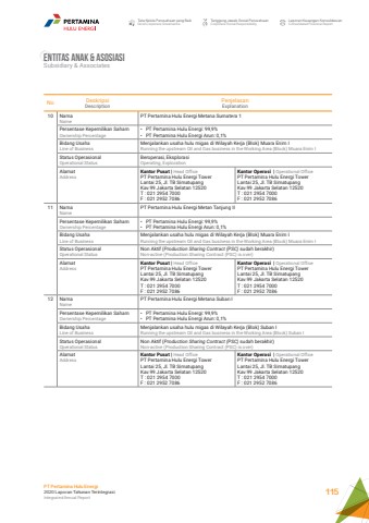 Entitas anak & AsosiasiSubsidiary & AssociatesNo DeskripsiDescriptionPenjelasanExplanation10 NamaNamePT Pertamina Hulu Energi Metana Sumatera 1Persentase Kepemilikan SahamOwnership Percentage%u2022 PT Pertamina Hulu Energi: 99,9%%u2022 PT Pertamina Hulu Energi Arun: 0,1%Bidang UsahaLine of BusinessMenjalankan usaha hulu migas di Wilayah Kerja (Blok) Muara Enim IRunning the upstream Oil and Gas business in the Working Area (Block) Muara Enim IStatus OperasionalOperational StatusBeroperasi, EksplorasiOperating, ExplorationAlamatAddressKantor Pusat | Head OfficePT Pertamina Hulu Energi Tower Lantai 25, Jl. TB Simatupang Kav.99 Jakarta Selatan 12520 T : 021 2954 7000F : 021 2952 7086Kantor Operasi | Operational OfficePT Pertamina Hulu Energi Tower Lantai 25, Jl. TB Simatupang Kav.99 Jakarta Selatan 12520 T : 021 2954 7000F : 021 2952 708611 NamaNamePT Pertamina Hulu Energi Metan Tanjung IIPersentase Kepemilikan SahamOwnership Percentage%u2022 PT Pertamina Hulu Energi: 99,9%%u2022 PT Pertamina Hulu Energi Arun: 0,1%Bidang UsahaLine of BusinessMenjalankan usaha hulu migas di Wilayah Kerja (Blok) Muara Enim IRunning the upstream Oil and Gas business in the Working Area (Block) Muara Enim IStatus OperasionalOperational StatusNon Aktif (Production Sharing Contract (PSC) sudah berakhir)Non-active (Production Sharing Contract (PSC) is over)AlamatAddressKantor Pusat | Head OfficePT Pertamina Hulu Energi Tower Lantai 25, Jl. TB Simatupang Kav.99 Jakarta Selatan 12520 T : 021 2954 7000F : 021 2952 7086Kantor Operasi | Operational OfficePT Pertamina Hulu Energi Tower Lantai 25, Jl. TB Simatupang Kav.99 Jakarta Selatan 12520 T : 021 2954 7000F : 021 2952 708612 NamaNamePT Pertamina Hulu Energi Metana Suban IPersentase Kepemilikan SahamOwnership Percentage%u2022 PT Pertamina Hulu Energi: 99,9%%u2022 PT Pertamina Hulu Energi Arun: 0,1%Bidang UsahaLine of BusinessMenjalankan usaha hulu migas di Wilayah Kerja (Blok) Suban IRunning the upstream Oil and Gas business in the Working Area (Block) Suban IStatus OperasionalOperational StatusNon Aktif (Production Sharing Contract (PSC) sudah berakhir)Non-active (Production Sharing Contract (PSC) is over)AlamatAddressKantor Pusat | Head OfficePT Pertamina Hulu Energi Tower Lantai 25, Jl. TB Simatupang Kav.99 Jakarta Selatan 12520 T : 021 2954 7000F : 021 2952 7086Kantor Operasi | Operational OfficePT Pertamina Hulu Energi Tower Lantai 25, Jl. TB Simatupang Kav.99 Jakarta Selatan 12520 T : 021 2954 7000F : 021 2952 7086Tata Kelola Perusahaan yang BaikGood Corporate GovernanceTanggung Jawab Sosial PerusahaanCorporate Social ResponsibilityLaporan Keuangan KonsolidasianConsolidated Financial ReportPT Pertamina Hulu Energi2020 Laporan Tahunan TerintegrasiIntegrated Annual Report 115