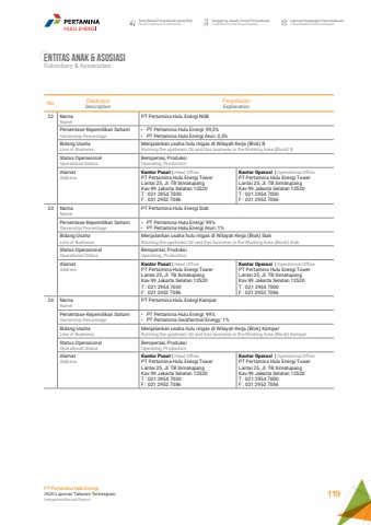 No DeskripsiDescriptionPenjelasanExplanation22 NamaNamePT Pertamina Hulu Energi NSBPersentase Kepemilikan SahamOwnership Percentage%u2022 PT Pertamina Hulu Energi: 99,5%%u2022 PT Pertamina Hulu Energi Arun: 0,5%Bidang UsahaLine of BusinessMenjalankan usaha hulu migas di Wilayah Kerja (Blok) BRunning the upstream Oil and Gas business in the Working Area (Block) BStatus OperasionalOperational StatusBeroperasi, ProduksiOperating, ProductionAlamatAddressKantor Pusat | Head OfficePT Pertamina Hulu Energi Tower Lantai 25, Jl. TB Simatupang Kav.99 Jakarta Selatan 12520 T : 021 2954 7000F : 021 2952 7086Kantor Operasi | Operational OfficePT Pertamina Hulu Energi Tower Lantai 25, Jl. TB Simatupang Kav.99 Jakarta Selatan 12520 T : 021 2954 7000F : 021 2952 708623 NamaNamePT Pertamina Hulu Energi SiakPersentase Kepemilikan SahamOwnership Percentage%u2022 PT Pertamina Hulu Energi: 99%%u2022 PT Pertamina Hulu Energi Arun: 1%Bidang UsahaLine of BusinessMenjalankan usaha hulu migas di Wilayah Kerja (Blok) SiakRunning the upstream Oil and Gas business in the Working Area (Block) SiakStatus OperasionalOperational StatusBeroperasi, ProduksiOperating, ProductionAlamatAddressKantor Pusat | Head OfficePT Pertamina Hulu Energi Tower Lantai 25, Jl. TB Simatupang Kav.99 Jakarta Selatan 12520 T : 021 2954 7000F : 021 2952 7086Kantor Operasi | Operational OfficePT Pertamina Hulu Energi Tower Lantai 25, Jl. TB Simatupang Kav.99 Jakarta Selatan 12520 T : 021 2954 7000F : 021 2952 708624 NamaNamePT Pertamina Hulu Energi KamparPersentase Kepemilikan SahamOwnership Percentage%u2022 PT Pertamina Hulu Energi: 99%%u2022 PT Pertamina Geothermal Energy: 1%Bidang UsahaLine of BusinessMenjalankan usaha hulu migas di Wilayah Kerja (Blok) KamparRunning the upstream Oil and Gas business in the Working Area (Block) KamparStatus OperasionalOperational StatusBeroperasi, ProduksiOperating, ProductionAlamatAddressKantor Pusat | Head OfficePT Pertamina Hulu Energi Tower Lantai 25, Jl. TB Simatupang Kav.99 Jakarta Selatan 12520 T : 021 2954 7000F : 021 2952 7086Kantor Operasi | Operational OfficePT Pertamina Hulu Energi Tower Lantai 25, Jl. TB Simatupang Kav.99 Jakarta Selatan 12520 T : 021 2954 7000F : 021 2952 7086Entitas anak & AsosiasiSubsidiary & AssociatesTata Kelola Perusahaan yang BaikGood Corporate GovernanceTanggung Jawab Sosial PerusahaanCorporate Social ResponsibilityLaporan Keuangan KonsolidasianConsolidated Financial ReportPT Pertamina Hulu Energi2020 Laporan Tahunan TerintegrasiIntegrated Annual Report 119