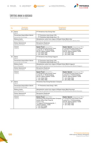 No DeskripsiDescriptionPenjelasanExplanation25 NamaNamePT Pertamina Hulu Energi AbarPersentase Kepemilikan SahamOwnership Percentage%u2022 PT Pertamina Hulu Energi: 99%%u2022 PT Pertamina Hulu Energi Arun: 1%Bidang UsahaLine of BusinessMenjalankan usaha hulu migas di Wilayah Kerja (Blok) AbarRunning the upstream Oil and Gas business in the Working Area (Block) AbarStatus OperasionalOperational StatusBeroperasi, EksplorasiOperating, ExplorationAlamatAddressKantor Pusat | Head OfficePT Pertamina Hulu Energi Tower Lantai 25, Jl. TB Simatupang Kav.99 Jakarta Selatan 12520 T : 021 2954 7000F : 021 2952 7086Kantor Operasi | Operational OfficePT Pertamina Hulu Energi Tower Lantai 25, Jl. TB Simatupang Kav.99 Jakarta Selatan 12520 T : 021 2954 7000F : 021 2952 708626 NamaNamePT Pertamina Hulu Energi AnggursiPersentase Kepemilikan SahamOwnership Percentage%u2022 PT Pertamina Hulu Energi: 99%%u2022 PT Pertamina Hulu Energi Arun: 1%Bidang UsahaLine of BusinessMenjalankan usaha hulu migas di Wilayah Kerja (Blok) AnggursiRunning the upstream Oil and Gas business in the Working Area (Block) AnggursiStatus OperasionalOperational StatusBeroperasi, EksplorasiOperating, ExplorationAlamatAddressKantor Pusat | Head OfficePT Pertamina Hulu Energi Tower Lantai 25, Jl. TB Simatupang Kav.99 Jakarta Selatan 12520 T : 021 2954 7000F : 021 2952 7086Kantor Operasi | Operational OfficePT Pertamina Hulu Energi Tower Lantai 25, Jl. TB Simatupang Kav.99 Jakarta Selatan 12520 T : 021 2954 7000F : 021 2952 708627 NamaNamePertamina Hulu Energi Nunukan CompanyPersentase Kepemilikan SahamOwnership Percentage%u2022 PT Pertamina Hulu Energi: 100%Bidang UsahaLine of BusinessMenjalankan usaha hulu migas di Wilayah Kerja (Blok) NunukanRunning the upstream Oil and Gas business in the Working Area (Block) NunukanStatus OperasionalOperational StatusBeroperasi, EksplorasiOperating, ExplorationAlamatAddressKantor Pusat | Head OfficePertamina Hulu Energi Nunukan CompanyAntam Office Park Tower B, Level 17-18Jl. Letjend TB Simatupang No. 1 Jakarta Selatan- 12530 T : 021-29712200F : 021-29634977Kantor Operasi | Operational OfficePT Pertamina Hulu Energi Tower Lantai 25, Jl. TB Simatupang Kav.99 Jakarta Selatan 12520 T : 021 2954 7000F : 021 2952 7086Entitas anak & AsosiasiSubsidiary & AssociatesLaporan ManajemenManagement ReportProfil PerusahaanCompany ProfileAnalisa & Diskusi ManajemenManagement Discussion & AnalysisIkhtisar 20202020 HighlightsPT Pertamina Hulu Energi2020 Laporan Tahunan TerintegrasiIntegrated Annual Report 120