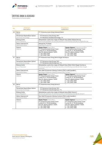 No DeskripsiDescriptionPenjelasanExplanation40 NamaNamePT Pertamina Hulu Energi Salawati BasinPersentase Kepemilikan SahamOwnership Percentage%u2022 PT Pertamina Hulu Energi: 99%%u2022 PT Pertamina Geothermal Energy: 1%Bidang UsahaLine of BusinessMenjalankan usaha hulu migas di Wilayah Kerja (Blok) Kepala BurungRunning the upstream Oil and Gas business in the Working Area (Block) Kepala BurungStatus OperasionalOperational StatusBeroperasi, ProduksiOperating, ProductionAlamatAddressKantor Pusat | Head OfficePT Pertamina Hulu Energi Tower Lantai 25, Jl. TB Simatupang Kav.99 Jakarta Selatan 12520 T : 021 2954 7000F : 021 2952 7086Kantor Operasi | Operational OfficePT Pertamina Hulu Energi Tower Lantai 25, Jl. TB Simatupang Kav.99 Jakarta Selatan 12520 T : 021 2954 7000F : 021 2952 708641 NamaNamePT Pertamina Hulu Energi West Glagah KambunaPersentase Kepemilikan SahamOwnership Percentage%u2022 PT Pertamina Hulu Energi: 99%%u2022 PT Pertamina Hulu Energi Arun: 1%Bidang UsahaLine of BusinessMenjalankan usaha hulu migas di Wilayah Kerja (Blok) West Glagah KambunaRunning the upstream Oil and Gas business in the Working Area (Block) West GlagahKambunaStatus OperasionalOperational StatusNon Aktif (Production Sharing Contract (PSC) sudah berakhir)Non-active (Production Sharing Contract (PSC) is over)AlamatAddressKantor Pusat | Head OfficePT Pertamina Hulu Energi Tower Lantai 25, Jl. TB Simatupang Kav.99 Jakarta Selatan 12520 T : 021 2954 7000F : 021 2952 7086Kantor Operasi | Operational OfficePT Pertamina Hulu Energi Tower Lantai 25, Jl. TB Simatupang Kav.99 Jakarta Selatan 12520 T : 021 2954 7000F : 021 2952 708642 NamaNamePT Pertamina Hulu Energi Semai IIPersentase Kepemilikan SahamOwnership Percentage%u2022 PT Pertamina Hulu Energi: 99%%u2022 PT Pertamina Hulu Energi Arun: 1%Bidang UsahaLine of BusinessMenjalankan usaha hulu migas di Wilayah Kerja (Blok) Semai IIRunning the upstream Oil and Gas business in the Working Area (Block) Semai IIStatus OperasionalOperational StatusNon Aktif (Production Sharing Contract (PSC) sudah berakhir)Non-active (Production Sharing Contract (PSC) is over)AlamatAddressKantor Pusat | Head OfficePT Pertamina Hulu Energi Tower Lantai 25, Jl. TB Simatupang Kav.99 Jakarta Selatan 12520 T : 021 2954 7000F : 021 2952 7086Kantor Operasi | Operational OfficePT Pertamina Hulu Energi Tower Lantai 25, Jl. TB Simatupang Kav.99 Jakarta Selatan 12520 T : 021 2954 7000F : 021 2952 7086Entitas anak & AsosiasiSubsidiary & AssociatesTata Kelola Perusahaan yang BaikGood Corporate GovernanceTanggung Jawab Sosial PerusahaanCorporate Social ResponsibilityLaporan Keuangan KonsolidasianConsolidated Financial ReportPT Pertamina Hulu Energi2020 Laporan Tahunan TerintegrasiIntegrated Annual Report 125