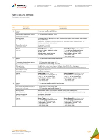No DeskripsiDescriptionPenjelasanExplanation46 NamaNamePertamina Hulu Energi Oil & GasPersentase Kepemilikan SahamOwnership PercentagePT Pertamina Hulu Energi: 100%Bidang UsahaLine of BusinessPemegang saham Natuna 2 BV yang menjalankan usaha hulu migas di wilayah kerja (Blok) Natuna Sea AShareholder of Natuna 2 BV which Running the upstream Oil and Gas business in the Working Area (Block) Natuna Sea AStatus OperasionalOperational StatusBeroperasi, ProduksiOperating, ProductionAlamatAddressKantor Pusat | Head OfficeCorporate Agent Maples & Calder PO BOX 309Ugland House, Grand Cayman KY1-1104, Cayman IslandKantor Operasi | Operational OfficePT Pertamina Hulu Energi Tower Lantai 25, Jl. TB Simatupang Kav.99 Jakarta Selatan 12520 T : 021 2954 7000F : 021 2952 708647 NamaNamePT Pertamina Hulu Energi East SepingganPersentase Kepemilikan SahamOwnership Percentage%u2022 PT Pertamina Hulu Energi: 99%%u2022 PT Pertamina Hulu Energi Arun: 1%Bidang UsahaLine of BusinessMenjalankan usaha hulu migas di Wilayah Kerja (Blok) East SepingganRunning the upstream Oil and Gas business in the Working Area (Block) East SepingganStatus OperasionalOperational StatusBeroperasi, EksplorasiOperating, ExplorationAlamatAddressKantor Pusat | Head OfficePT Pertamina Hulu Energi Tower Lantai 25, Jl. TB Simatupang Kav.99 Jakarta Selatan 12520 T : 021 2954 7000F : 021 2952 7086Kantor Operasi | Operational OfficePT Pertamina Hulu Energi Tower Lantai 25, Jl. TB Simatupang Kav.99 Jakarta Selatan 12520 T : 021 2954 7000F : 021 2952 708648 NamaNamePT Pertamina Hulu Energi MNK SakakemangPersentase Kepemilikan SahamOwnership Percentage%u2022 PT Pertamina Hulu Energi: 99%%u2022 PT Pertamina Geothermal Energy: 1%Bidang UsahaLine of BusinessMenjalankan usaha hulu migas di Wilayah Kerja (Blok) SakakemangRunning the upstream Oil and Gas business in the Working Area (Block) SakakemangStatus OperasionalOperational StatusBeroperasi, EksplorasiOperating, ExplorationAlamatAddressKantor Pusat | Head OfficePT Pertamina Hulu Energi Tower Lantai 25, Jl. TB Simatupang Kav.99 Jakarta Selatan 12520 T : 021 2954 7000F : 021 2952 7086Kantor Operasi | Operational OfficePT Pertamina Hulu Energi Tower Lantai 25, Jl. TB Simatupang Kav.99 Jakarta Selatan 12520 T : 021 2954 7000F : 021 2952 7086Entitas anak & AsosiasiSubsidiary & AssociatesTata Kelola Perusahaan yang BaikGood Corporate GovernanceTanggung Jawab Sosial PerusahaanCorporate Social ResponsibilityLaporan Keuangan KonsolidasianConsolidated Financial ReportPT Pertamina Hulu Energi2020 Laporan Tahunan TerintegrasiIntegrated Annual Report 127