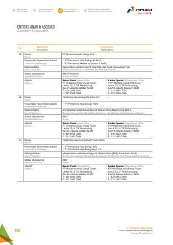 No DeskripsiDescriptionPenjelasanExplanation55 NamaNamePT Pertamina Hulu Energi ArunPersentase Kepemilikan SahamOwnership Percentage%u2022 PT Pertamina Hulu Energi: 99.997% %u2022 PT Pertamina Pedeve Indonesia: 0.003% Bidang UsahaLine of BusinessKepemilikan saham atas PT Arun NGL dan Anak Perusahaan PHEShare ownership of PT Arun NGL and PHE SubsidiariesStatus OperasionalOperational StatusAktif, PortofolioActive, PortfolioAlamatAddressKantor Pusat | Head OfficePT Pertamina Hulu Energi Tower Lantai 25, Jl. TB Simatupang Kav.99 Jakarta Selatan 12520 T : 021 2954 7000F : 021 2952 7086Kantor Operasi | Operational OfficePT Pertamina Hulu Energi Tower Lantai 25, Jl. TB Simatupang Kav.99 Jakarta Selatan 12520 T : 021 2954 7000F : 021 2952 708656 NamaNamePertamina Hulu Energi Oil & Gas B.VPersentase Kepemilikan SahamOwnership Percentage%u2022 PT Pertamina Hulu Energi: 100% Bidang UsahaLine of BusinessMenjalankan usaha hulu migas di Wilayah Kerja Natuna Sea Blok ARunning the upstream Oil and Gas business in the Working Area Natuna Sea Block AStatus OperasionalOperational StatusAktifActiveAlamatAddressKantor Pusat | Head OfficePT Pertamina Hulu Energi Tower Lantai 25, Jl. TB Simatupang Kav.99 Jakarta Selatan 12520 T : 021 2954 7000F : 021 2952 7086Kantor Operasi | Operational OfficePT Pertamina Hulu Energi Tower Lantai 25, Jl. TB Simatupang Kav.99 Jakarta Selatan 12520 T : 021 2954 7000F : 021 2952 708657 NamaNamePertamina Hulu Energi South East JambiPersentase Kepemilikan SahamOwnership Percentage%u2022 PT Pertamina Hulu Energi: 99%%u2022 PT Pertamina Hulu Energi Arun: 1%Bidang UsahaLine of BusinessMenjalankan usaha hulu migas di Wilayah Kerja (Blok) South East JambiRunning the upstream Oil and Gas business in the Working Area (Block) South East JambiStatus OperasionalOperational StatusAktifActiveAlamatAddressKantor Pusat | Head OfficePT Pertamina Hulu Energi Tower Lantai 25, Jl. TB Simatupang Kav.99 Jakarta Selatan 12520 T : 021 2954 7000F : 021 2952 7086Kantor Operasi | Operational OfficePT Pertamina Hulu Energi Tower Lantai 25, Jl. TB Simatupang Kav.99 Jakarta Selatan 12520 T : 021 2954 7000F : 021 2952 7086Entitas anak & AsosiasiSubsidiary & AssociatesLaporan ManajemenManagement ReportProfil PerusahaanCompany ProfileAnalisa & Diskusi ManajemenManagement Discussion & AnalysisIkhtisar 20202020 HighlightsPT Pertamina Hulu Energi2020 Laporan Tahunan TerintegrasiIntegrated Annual Report 130