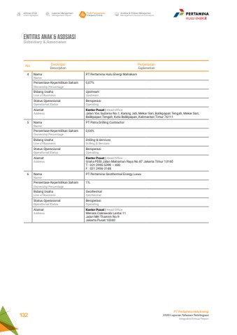 No DeskripsiDescriptionPenjelasanExplanation4 NamaNamePT Pertamina Hulu Energi MahakamPersentase Kepemilikan SahamOwnership Percentage0,07%Bidang UsahaLine of BusinessUpstreamUpstreamStatus OperasionalOperational StatusBeroperasiOperatingAlamatAddressKantor Pusat | Head OfficeJalan Yos Sudarso No.1, Karang Jati, Mekar Sari, Balikpapan Tengah, Mekar Sari, Balikpapan Tengah, Kota Balikpapan, Kalimantan Timur 761115 NamaNamePT Patra Drilling ContractorPersentase Kepemilikan SahamOwnership Percentage0,04%Bidang UsahaLine of BusinessDrilling & ServicesDrilling & ServicesStatus OperasionalOperational StatusBeroperasiOperatingAlamatAddressKantor Pusat | Head OfficeGraha PDSI Jalan Matraman Raya No.87 Jakarta Timur 13140T : 021 2995 5399 %u2013 400F : 021 2956 31486 NamaNamePT Pertamina Geothermal Energy LawuPersentase Kepemilikan SahamOwnership Percentage1%Bidang UsahaLine of BusinessGeothermalGeothermalStatus OperasionalOperational StatusBeroperasiOperatingAlamatAddressKantor Pusat | Head OfficeMenara Cakrawala Lantai 11Jalan MH Thamrin No.9 Jakarta Pusat 10340Entitas anak & AsosiasiSubsidiary & AssociatesLaporan ManajemenManagement ReportProfil PerusahaanCompany ProfileAnalisa & Diskusi ManajemenManagement Discussion & AnalysisIkhtisar 20202020 HighlightsPT Pertamina Hulu Energi2020 Laporan Tahunan TerintegrasiIntegrated Annual Report 132