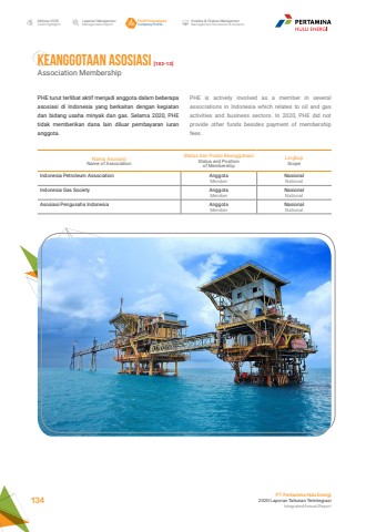 KEANGGOTAAN ASOSIASI [102-13]Association MembershipLaporan ManajemenManagement ReportProfil PerusahaanCompany ProfileAnalisa & Diskusi ManajemenManagement Discussion & AnalysisIkhtisar 20202020 HighlightsPT Pertamina Hulu Energi2020 Laporan Tahunan TerintegrasiIntegrated Annual Report 134PHE turut terlibat aktif menjadi anggota dalam beberapa asosiasi di Indonesia yang berkaitan dengan kegiatan dan bidang usaha minyak dan gas. Selama 2020, PHE tidak memberikan dana lain diluar pembayaran iuran anggota.PHE is actively involved as a member in several associations in Indonesia which relates to oil and gas activities and business sectors. In 2020, PHE did not provide other funds besides payment of membership fees.Nama AsosiasiName of AssociationStatus dan Posisi KeanggotaanStatus and Position of MembershipLingkupScopeIndonesia Petroleum Association AnggotaMemberNasionalNationalIndonesia Gas Society AnggotaMemberNasionalNationalAsosiasi Pengusaha Indonesia AnggotaMemberNasionalNational