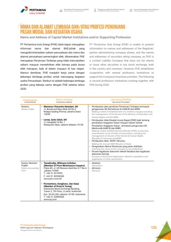 NAMA DAN ALAMAT LEMBAGA DAN/ATAU PROFESI PENUNJANG PASAR MODAL DAN KEGIATAN USAHAName and Address of Capital Market Institutions and/or Supporting ProfessionTata Kelola Perusahaan yang BaikGood Corporate GovernanceTanggung Jawab Sosial PerusahaanCorporate Social ResponsibilityLaporan Keuangan KonsolidasianConsolidated Financial ReportPT Pertamina Hulu Energi2020 Laporan Tahunan TerintegrasiIntegrated Annual Report 135PT Pertamina Hulu Energi (PHE) tidak dapat menyajikan informasi nama dan alamat BAE/pihak yang mengadministrasikan saham perusahaan dan nama dan alamat perusahaan pemeringkat efek, dikarenakan PHE merupakan Perseroan Terbatas yang tidak mencatatkan saham maupun menerbitkan efek lainnya pada bursa efek manapun, baik di dalam maupun di luar negeri. Namun demikian, PHE menjalin kerja sama dengan beberapa lembaga profesi untuk menunjang kegiatan usaha Perusahaan. Berikut ini adalah beberapa lembaga profesi yang bekerja sama dengan PHE selama tahun 2020:PT Pertamina Hulu Energi (PHE) is unable to present information on names and addresses of the Registrar/parties administering company shares, and the names and addresses of securities rating company, as PHE is a Limited Liability Company that does not list shares or issue other securities in any stock exchange, both in the country and overseas. However, PHE establishes cooperation with several profession institutions to support the Company%u2019s business activities. The following is several profession institutions working together with PHE during 2020:KelembagaanInstitutionalNama LembagaInstitution NameJasa yang DiberikanServices ProvidedNotaris Notary Public%u2022 Marianne Vincentia Hamdani, SH Jl. Boulevard Raya Blok K4 No.3 Kelapa Gading Permai Jakarta Utara 14240%u2022 Lenny Janis Ishak, SHJl. Hanglekir IX No. 1Kebayoran Baru Jakarta Selatan 12120 %u2022 Pembuatan akta pendirian Perseroan Terbatas termasuk pengurusan SK Kemenhum & HAM RI dan BNRI.Making a deed of establishment of a limited company including the management of the Decree of the Ministry of Education and Human Rights and the BNRI.%u2022 Pembuatan Akta Risalah Acara Rapat (PKR) baik tentang perubahan Anggaran Dasar maupun bukan terkait Perubahan Anggaran Dasar , termasuk pengurusan SK Menhum& HAM RI dan BNRI.Making a Deed of Meeting Event Minutes (PKR) concerning amendments to the Articles of Association, including the management of Decree of the Decree & Human Rights Republicof Indonesia and BNRI.%u2022 Pembuatan Akta RUPS Tahunan.Making the Annual GMS Minutes of Deed.%u2022 Pengecekan Nama Perseroan yang akan didirikan.Checking the name of the company to be established.%u2022 Proses legalisasi dokumen terkait likuidasi dan legalisasi dokumen lainnya.Process of document legalization related to liquidation and legalization of other documents.Kantor Akuntan PublikPublic Accounting Firm%u2022 Tanudiredja, Wibisana & Rekan (Member of Price Waterhouse Coopers) Plaza 89, Jl. HR Rasuna Said Kav X-7 No.6 Jakarta 12940T: +62 21 5212901 F: +62 21 52905555www.pwc.com/id%u2022 Purwantono, Sungkono, dan Surja (Member of Ernst & Young)Indonesia Stock Exchange Building, Tower 2, 7th Floor, Jl.Jend. Sudirman Kav. 52-53, DKI Jakarta 12190, IndonesiaT: +62 21 52895000www.ey.com%u2022 Atestasi.Attestation.%u2022 Advisory.Advisory.