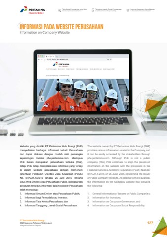 INFORMASI PADA WEBSITE PERUSAHAANInformation on Company WebsiteTata Kelola Perusahaan yang BaikGood Corporate GovernanceTanggung Jawab Sosial PerusahaanCorporate Social ResponsibilityLaporan Keuangan KonsolidasianConsolidated Financial ReportPT Pertamina Hulu Energi2020 Laporan Tahunan TerintegrasiIntegrated Annual Report 137Website yang dimiliki PT Pertamina Hulu Energi (PHE) menyediakan berbagai informasi terkait Perusahaan dan dapat diakses dengan mudah oleh pemangku kepentingan melalui phe.pertamina.com. Meskipun PHE bukan merupakan perusahaan terbuka (Tbk), tetapi PHE tetap menyelaraskan informasi yang tersaji di dalam website perusahaan dengan memenuhi ketentuan Peraturan Otoritas Jasa Keuangan (POJK) No. 8/POJK.4/2015 tanggal 25 Juni 2015 Tentang Situs Web Emiten Atau Perusahaan Publik. Berdasarkan peraturan tersebut, informasi dalam website Perusahaan telah mencakup:1. Informasi Umum Emiten atau Perusahaan Publik;2. Informasi bagi Pemodal atau Investor;3. Informasi Tata Kelola Perusahaan; dan4. Informasi Tanggung Jawab Sosial Perusahaan.The website owned by PT Pertamina Hulu Energi (PHE) provides various information related to the Company, and it can be easily accessed by the stakeholders through phe.pertamina.com. Although PHE is not a public company (Tbk), PHE continues to align the presented information on the website with the provisions in the Financial Services Authority Regulation (POJK) Number 8/POJK.4.2015 of 25 June 2015 concerning the Issuer or Public Company Website. According to the regulation, the information on the Company website has included the following:1. General Information of Issuers or Public Companies;2. Information for Investors;3. Information on Corporate Governance; and4. Information on Corporate Social Responsibility.