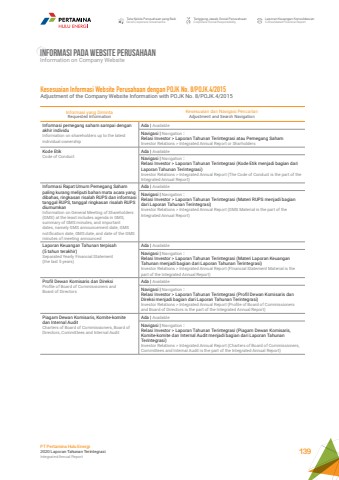 Informasi pada website perusahaanInformation on Company WebsiteKesesuaian Informasi Website Perusahaan dengan POJK No. 8/POJK.4/2015Adjustment of the Company Website Information with POJK No. 8/POJK.4/2015Tata Kelola Perusahaan yang BaikGood Corporate GovernanceTanggung Jawab Sosial PerusahaanCorporate Social ResponsibilityLaporan Keuangan KonsolidasianConsolidated Financial ReportPT Pertamina Hulu Energi2020 Laporan Tahunan TerintegrasiIntegrated Annual Report 139Informasi yang DimintaRequested InformationKesesuaian dan Navigasi PencarianAdjustment and Search NavigationInformasi pemegang saham sampai dengan akhir individuInformation on shareholders up to the latest individual ownershipAda | AvailableNavigasi | Navigation : Relasi Investor > Laporan Tahunan Terintegrasi atau Pemegang SahamInvestor Relations > Integrated Annual Report or SharholdersKode EtikCode of ConductAda | AvailableNavigasi | Navigation : Relasi Investor > Laporan Tahunan Terintegrasi (Kode Etik menjadi bagian dari Laporan Tahunan Terintegrasi)Investor Relations > Integrated Annual Report (The Code of Conduct is the part of the Integrated Annual Report)Informasi Rapat Umum Pemegang Saham paling kurang meliputi bahan mata acara yang dibahas, ringkasan risalah RUPS dan informasi tanggal RUPS, tanggal ringkasan risalah RUPS diumumkanInformation on General Meeting of Shareholders (GMS) at the least includes agenda in GMS, summary of GMS minutes, and important dates, namely GMS announcement date, GMS notification date, GMS date, and date of the GMS minutes of meeting announcedAda | AvailableNavigasi | Navigation : Relasi Investor > Laporan Tahunan Terintegrasi (Materi RUPS menjadi bagian dari Laporan Tahunan Terintegrasi)Investor Relations > Integrated Annual Report (GMS Material is the part of the Integrated Annual Report)Laporan Keuangan Tahunan terpisah (5 tahun terakhir)Separated Yearly Financial Statement (the last 5 years)Ada | AvailableNavigasi | Navigation : Relasi Investor > Laporan Tahunan Terintegrasi (Materi Laporan Keuangan Tahunan menjadi bagian dari Laporan Tahunan Terintegrasi)Investor Relations > Integrated Annual Report (FInancial Statement Material is the part of the Integrated Annual Report)Profil Dewan Komisaris dan DireksiProfile of Board of Commissioners and Board of DirectorsAda | AvailableNavigasi | Navigation : Relasi Investor > Laporan Tahunan Terintegrasi (Profil Dewan Komisaris dan Direksi menjadi bagian dari Laporan Tahunan Terintegrasi)Investor Relations > Integrated Annual Report (Profile of Board of Commissioners and Board of Directors is the part of the Integrated Annual Report)Piagam Dewan Komisaris, Komite-komite dan Internal Audit Charters of Board of Commissioners, Board of Directors, Committees and Internal Audit Ada | AvailableNavigasi | Navigation : Relasi Investor > Laporan Tahunan Terintegrasi (Piagam Dewan Komisaris, Komite-komite dan Internal Audit menjadi bagian dari Laporan Tahunan Terintegrasi)Investor Relations > Integrated Annual Report (Charters of Board of Commissioners, Committees and Internal Audit is the part of the Integrated Annual Report)