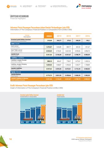 Laporan ManajemenManagement ReportProfil PerusahaanCompany ProfileAnalisa & Diskusi ManajemenManagement Discussion & AnalysisIkhtisar 20202020 HighlightsPT Pertamina Hulu Energi2020 Laporan Tahunan TerintegrasiIntegrated Annual Report 14Ikhtisar KeuanganFinancial HighlightsUraianDescription 2020 2019 2018 2017 2016Investasi pada Entitas Asosiasi Investments in Associates 310,38 293,77 279,3 240,52 195,1 Aset | AssetsAset LancarCurrent Assets 1.372,07 1.403,89 889,77 841,53 811,67 Aset Tidak LancarNon-current Assets 3.949,29 3.722,51 3.641,90 3.939,26 4.096,72 Jumlah AsetTotal Assets 5.321,36 5.126,40 4.531,67 4.780,79 4.908,39Liabilitas | LiabilitiesLiabilitas Jangka PendekShort-term Liability 888,10 826,37 778,97 1.477,67 1.229,16 Liablitas Jangka PanjangLong-term Liablity 1.659,54 1.468,07 1.294,04 1.234,77 1.738,89 Jumlah LiabilitasTotal Liabilities 2.547,63 2.294,45 2.073,01 2.712,44 2.968,05 Equity | EkuitasJumlah EkuitasTotal Equity 2.773,73 2.831,95 2.458,66 2.068,35 1.940,34Jumlah Liabilitas & EkuitasTotal Liabilities & Equity 5.321,36 5.126,40 4.531,67 4.780,79 4.908,39 Informasi Posisi Keuangan Perusahaan dalam Bentuk Perbandingan (juta USD)Information of The Company%u2019s Financial Position in Comparative Form (million USD)Grafik Informasi Posisi Keuangan Perusahaan (juta USD)Graph of Information of The Company%u2019s Financial Position (million USD)195,1 279,3 4.908,394.531,67293,775.126,40 310.385.321,36 240,524.780,792016 2017 2018 2019 2020 2016 2017 2018 2019 2020Investasi pada Entitas AsosiasiInvestments in AssociatesJumlah AsetTotal Assets