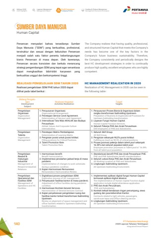 SUMBER DAYA MANUSIAHuman CapitalLaporan ManajemenManagement ReportProfil PerusahaanCompany ProfileAnalisa & Diskusi ManajemenManagement Discussion & AnalysisIkhtisar 20202020 HighlightsPT Pertamina Hulu Energi2020 Laporan Tahunan TerintegrasiIntegrated Annual Report 140Perseroan menyadari bahwa tersedianya Sumber Daya Manusia (%u201dSDM%u201d) yang berkualitas, profesional, terstruktur dan sesuai dengan kebutuhan Perseroan menjadi salah satu faktor penentu keberlangsungan bisnis Perseroan di masa depan. Oleh karenanya, Perseroan secara konsisten dan berkala merancang strategi pengembangan SDM yang tepat agar senantiasa dapat menghasilkan bibit-bibit karyawan yang berkualitas unggul dan berkompetensi tinggi. REALISASI PENGELOLAAN SDM TAHUN 2020Realisasi pengelolaan SDM PHE tahun 2020 dapat dilihat pada tabel berikut :The Company realizes that having quality, professional, and structured Human Capital that meets the Company%u2019s needs has become one of the key factors in the Company%u2019s future business sustainability. Therefore, the Company consistently and periodically designs the best HC development strategies in order to continually produce high quality, excellent employees who are highly competent.HC MANAGEMENT REALIZATION IN 2020Realization of HC Management in 2020 can be seen in the following table :Bidang PengelolaanDevelopment SubjectRealisasi KegiatanActivities RealizationTargetTargetsPengelolaan OrganisasiOrganization Management1. Penyusunan Organisasi.Organizational Arrangement.2. Penetapan Service Level Agreement.Determination of Service Level Agreement 3. Internalisasi Tata Nilai AKHLAK dan Budaya Perusahaan.Akhlak Values And Corporate Culture Internalization.1. Penyusunan Proses Bisnis & Organisasi dalam rangka transformasi Subholding Upstream.Preparation of Business & Organizational Processes for Upstream Subholding transformation.2. Layanan Fungsi Human Capital.Human Capital Function Services.3. Seluruh Pekerja PHE dan Anak Perusahaan.EAll employees of PHE and Subsidiaries.Pengelolaan TalentaOrganization Management1. Penetapan Matrix Pembelajaran.Determination of Learning Matrix.2. Pengisian posisi untuk posisi kritikal.Filling positions for Critical Positions.3. Talent Promotion Rate.Talent Promotion Rate1. Seluruh Skill Group.All Skill Group.2. Pengisian sebanyak 90,5% posisi kritikal.Fulfilling as much as 90.5% of critical positions.3. Proses promosi pekerja dalam talent pool sebanyak 16.59% dari seluruh populasi talent pool.Employee promotion processes in Talent pool is\from all talent pool population.Pengelolaan Reward & Hubungan IndustrialManagement of Reward & Industrial Relations1. Harmonisasi benefit.Benefit harmonization.2. Implementasi perubahan jadwal kerja di masa pandemi.Implementation of changes to work schedules during a pandemic condition.3. Kajian Harmonisasi Remunerasi.Remuneration Harmonization Review.1. Standarisasi benefit PHE dan Anak Perusahaan PHE.PHE and PHE Subsidiaries benefit standardization.2. Seluruh Lokasi Kerja PHE dan Anak Perusahaan.All Working Location at PHE and Subsidiaries. 3. Lingkungan Subholding Upstream.All Upstream Subholding Environment.Pengelolaan Operasional dan Fasilitas SDMManagement of Operations and HC Facilities1. Digitalisasi proses pengelolaan SDM.Digitization process of HC management.2. Penyesuaian fasilitas kantor di masa pandemi.Adjustment of office Facilities during pandemic condition.3. Harmonisasi Kontrak General Services.Harmonization of General Services Contract.4. Kajian penyelarasan pengelolaan ruang dan fasilitas kantor terkait transformasi Subholding Upstream.Review on alignment of space management and office facilities related to Upstream Subholding transformation.1. Implementasi aplikasi digital fungsi Human Capital termasuk aplikasi digital absensi.The implementation of Human Capital Function digital application include digital attendance application.2. PHE dan Anak Perusahaan; PHE and Subsidiaries;3. Kontrak terkait kendaraan ringan penumpang, sewa gudang dan jasa kebersihan Kantor.Contracts related to light vehicles, passengers, warehouse lease and Office cleaning service.4. Lingkungan Subholding Upstream.All Upstream Subholding Environment.