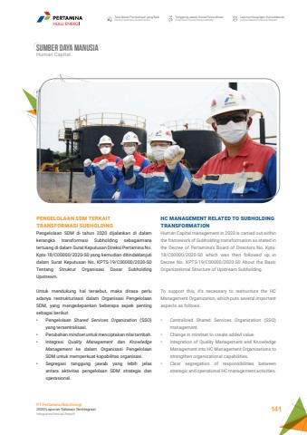 Sumber daya manusiaHuman CapitalSumber daya manusiaHuman CapitalTata Kelola Perusahaan yang BaikGood Corporate GovernanceTanggung Jawab Sosial PerusahaanCorporate Social ResponsibilityLaporan Keuangan KonsolidasianConsolidated Financial ReportPT Pertamina Hulu Energi2020 Laporan Tahunan TerintegrasiIntegrated Annual Report 141PENGELOLAAN SDM TERKAIT TRANSFORMASI SUBHOLDINGPengelolaan SDM di tahun 2020 dijalankan di dalam kerangka transformasi Subholding sebagaimana tertuang di dalam Surat Keputusan Direksi Pertamina No. Kpts-18/C00000/2020-S0 yang kemudian ditindaklanjuti dalam Surat Keputusan No. KPTS-19/C00000/2020-S0 Tentang Struktur Organisasi Dasar Subholding Upstream.Untuk mendukung hal tersebut, maka dirasa perlu adanya restrukturisasi dalam Organisasi Pengelolaan SDM, yang mengedepankan beberapa aspek penting sebagai berikut:%u2022 Pengelolaan Shared Services Organization (SSO) yang tersentralisasi.%u2022 Perubahan mindset untuk menciptakan nilai tambah. %u2022 Integrasi Quality Management dan Knowledge Management ke dalam Organisasi Pengelolaan SDM untuk memperkuat kapabilitas organisasi.%u2022 Segregasi tanggung jawab yang lebih jelas antara aktivitas pengelolaan SDM strategis dan operasional.HC MANAGEMENT RELATED TO SUBHOLDING TRANSFORMATIONHuman Capital management in 2020 is carried out within the framework of Subholding transformation as stated in the Decree of Pertamina%u2019s Board of Directors No. Kpts18/C00000/2020-S0 which was then followed up in Decree No. KPTS-19/C00000/2020-S0 About the Basic Organizational Structure of Upstream Subholding.To support this, it%u2019s necessary to restructure the HC Management Organization, which puts several important aspects as follows:%u2022 Centralized Shared Services Organization (SSO) management.%u2022 Change in mindset to create added value.%u2022 Integration of Quality Management and Knowledge Management into HC Management Organizations to strengthen organizational capabilities.%u2022 Clear segregation of responsibilities between strategic and operational HC management activities.