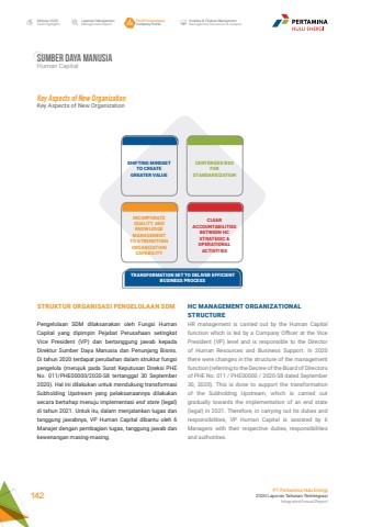 Sumber daya manusiaHuman CapitalLaporan ManajemenManagement ReportProfil PerusahaanCompany ProfileAnalisa & Diskusi ManajemenManagement Discussion & AnalysisIkhtisar 20202020 HighlightsPT Pertamina Hulu Energi2020 Laporan Tahunan TerintegrasiIntegrated Annual Report 142Key Aspects of New OrganizationKey Aspects of New OrganizationSHIFTING MINDSET TO CREATE GREATER VALUEINCORPORATE QUALITY AND KNOWLEDGE MANAGEMENT TO STRENGTHEN ORGANIZATION CAPABILITYCLEAR ACCOUNTABILITIES BETWEEN HC STRATEGIC & OPERATIONAL ACTIVITIESCENTERIZED BSOFORSTANDARDIZATIONTRANSFORMATION SET TO DELIVER EFFICIENT BUSINESS PROCESSHC MANAGEMENT ORGANIZATIONAL STRUCTURE HR management is carried out by the Human Capital function which is led by a Company Officer at the Vice President (VP) level and is responsible to the Director of Human Resources and Business Support. In 2020 there were changes in the structure of the management function (referring to the Decree of the Board of Directors of PHE No. 011 / PHE00000 / 2020-S8 dated September 30, 2020). This is done to support the transformation of the Subholding Upstream, which is carried out gradually towards the implementation of an end state (legal) in 2021. Therefore, in carrying out its duties and responsibilities, VP Human Capital is assisted by 6 Managers with their respective duties, responsibilities and authorities.STRUKTUR ORGANISASI PENGELOLAAN SDMPengelolaan SDM dilaksanakan oleh Fungsi Human Capital yang dipimpin Pejabat Perusahaan setingkat Vice President (VP) dan bertanggung jawab kepada Direktur Sumber Daya Manusia dan Penunjang Bisnis. Di tahun 2020 terdapat perubahan dalam struktur fungsi pengelola (merujuk pada Surat Keputusan Direksi PHE No. 011/PHE00000/2020-S8 tertanggal 30 September 2020). Hal ini dilakukan untuk mendukung transformasi Subholding Upstream yang pelaksanaannya dilakukan secara bertahap menuju implementasi end state (legal) di tahun 2021. Untuk itu, dalam menjalankan tugas dan tanggung jawabnya, VP Human Capital dibantu oleh 6 Manajer dengan pembagian tugas, tanggung jawab dan kewenangan masing-masing.