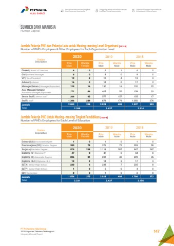 Sumber daya manusiaHuman CapitalTata Kelola Perusahaan yang BaikGood Corporate GovernanceTanggung Jawab Sosial PerusahaanCorporate Social ResponsibilityLaporan Keuangan KonsolidasianConsolidated Financial ReportPT Pertamina Hulu Energi2020 Laporan Tahunan TerintegrasiIntegrated Annual Report 147UraianDescription2020 2019 2018PriaMaleWanitaFemalePriaMaleWanitaMalePriaMaleWanitaMaleDireksi | Board of Directors 6 0 4 1 4 0GM | General Manager 6 0 8 0 9 0VP | Vice President 19 2 11 4 13 3Advisor | Advisor 16 0 14 0 17 2Manager/Setara | Manager/Equivalent 129 16 130 16 120 22Ass. Manager/Setara | Assistant Manager/Equivalent 172 46 405 52 159 33Senior Staff | Senior Staff 266 45 577 157 155 17Staff | Staff 1.386 289 879 179 1.050 276JumlahTotal2.000 398 2.028 409 1.527 3532.398 2.437 2.314Jumlah Pekerja PHE dan Pekerja Lain untuk Masing-masing Level Organisasi [102-8]Number of PHE%u2019s Employees & Other Employees for Each Organization Level UraianDescription2020 2019 2018PriaMaleWanitaFemalePriaMaleWanitaMalePriaMaleWanitaMaleDoktor (S3) | Doctorate Degree 1 0 1 0 1 0Pascasarjana (S2) | Master Degree 380 78 376 72 295 59Sarjana | Bachelor Degree 979 258 1.118 287 947 267Diploma IV | Diploma IV 47 0 47 0 44 0Diploma III | Associate Degree 206 31 231 40 239 35Diploma I & II | Diploma I & II 12 2 14 3 17 3SLTA | Senior High School 230 6 238 7 235 8SLTP | Junior High School 1 0 2 0 4 0SD | Elementary 0 0 1 0 2 0JumlahTotal1.856 375 2.028 409 1.784 3722.231 2.437 2.156Jumlah Pekerja PHE Untuk Masing-masing Tingkat Pendidikan [102-8]Number of PHE%u2019s Employees for Each Level of Education