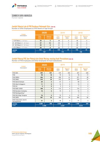 Sumber daya manusiaHuman CapitalTata Kelola Perusahaan yang BaikGood Corporate GovernanceTanggung Jawab Sosial PerusahaanCorporate Social ResponsibilityLaporan Keuangan KonsolidasianConsolidated Financial ReportPT Pertamina Hulu Energi2020 Laporan Tahunan TerintegrasiIntegrated Annual Report 149UraianDescription2020 2019 2018PriaMaleWanitaFemalePriaMaleWanitaMalePriaMaleWanitaMale<= 30 Tahun | <= 30 Years 39 2 38 3 26 231 - 40 Tahun | 31 - 40 Years 27 12 29 7 25 441 - 50 Tahun | 41 - 50 Years 35 5 31 7 22 7>= 51 Tahun | >= 51 Years 43 4 50 7 63 9JumlahTotal144 23 148 24 136 22167 172 158Jumlah Pekerja Lain di PHE Berdasar Kelompok Usia [102-8]Number of Other Employees at PHE Based on Age GroupsUraianDescription2020 2019 2018PriaMaleWanitaFemalePriaMaleWanitaMalePriaMaleWanitaMalePHE SSO 399 241 419 252 357 203PHE 98 18 79 16 78 17PHE ONWJ 436 42 453 41 471 45PHE WMO 310 32 315 33 323 31PHE Siak & Kampar 69 2 67 2 58 2PHE Abar & Anggursi 11 0 13 0 15 0PHE UH 3 0 5 0 7 0PHE NSB & NSO 108 4 113 4 110 4PHE Nunukan Company 16 6 19 6 16 5PHE Randugunting * - - - - 7 1PHE OK & Raja Tempirai 76 5 73 4 51 1PHE OSES 287 33 285 34 406 83PHE Tuban East Java & Randugunting 31 3 28 3 21 2JumlahTotal2.000 398 2.028 409 1.920 3942.398 2.437 2.314Jumlah Pekerja PHE dan Pekerja lain Untuk Masing-masing Anak Perusahaan [102-8]Number of PHE Employees and Other Employees for Each Subsidiaries