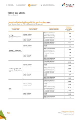 Laporan ManajemenManagement ReportProfil PerusahaanCompany ProfileAnalisa & Diskusi ManajemenManagement Discussion & AnalysisIkhtisar 20202020 HighlightsPT Pertamina Hulu Energi2020 Laporan Tahunan TerintegrasiIntegrated Annual Report 152Sumber daya manusiaHuman CapitalLevel JabatanPosition LevelJenis PelatihanType of TrainingTujuan PelatihanTraining ObjectivesTotal Jam PelatihanTotal Training HoursVP & GMVice President & General ManagerInhouse TrainingInhouse TrainingFunctional/TechnicalFunctional/Technical 1.023Soft Skills/LeadershipSoft Skills/Leadership 154Public TrainingPublic TrainingFunctional/TechnicalFunctional/Technical 30Manager & Sr. ManagerManager & Senior ManagerInhouse TrainingInhouse TrainingFunctional/TechnicalFunctional/Technical 5.166HSSEHSSE 969Soft Skills/LeadershipSoft Skills/Leadership 1.000Public TrainingPublic TrainingFunctional/TechnicalFunctional/Technical 330HSSEHSSE 110Soft Skills/LeadershipSoft Skills/Leadership 430Ass. Manager & Sr. StaffAssistant Manager & Senior StaffInhouse TrainingInhouse TrainingFunctional/TechnicalFunctional/Technical 23.324HSSEHSSE 3.029Soft Skills/LeadershipSoft Skills/Leadership 6.901Public TrainingPublic TrainingFunctional/TechnicalFunctional/Technical 1.320HSSEHSSE 950Soft Skills/LeadershipSoft Skills/Leadership 3.880StaffStaffInhouse TrainingInhouse TrainingFunctional/TechnicalFunctional/Technical 70.659HSSEHSSE 9.504Soft Skills/LeadershipSoft Skills/Leadership 25.771Public TrainingPublic TrainingFunctional/TechnicalFunctional/Technical 11.880HSSEHSSE 6.850Soft Skills/LeadershipSoft Skills/Leadership 10Jumlah Jam Pelatihan Bagi Pekerja PHE dan Anak Perusahaan [404-1] Total Training Hours for PHE and Subsidiaries%u2019 Employees