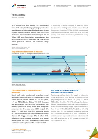 Tata Kelola Perusahaan yang BaikGood Corporate GovernanceTanggung Jawab Sosial PerusahaanCorporate Social ResponsibilityLaporan Keuangan KonsolidasianConsolidated Financial ReportPT Pertamina Hulu Energi2020 Laporan Tahunan TerintegrasiIntegrated Annual Report 159TINJAUAN umumGeneral Overviewis potentially 3% lower compared to trajectory before the pandemic. Existing fiscal stimulus issued through Government Regulation (PP) No. 43 2020 and successfu l development and vaccine distribution is an important starting point in economic recovery and national energy consumption.NATIONAL OIL AND GAS INDUSTRY PERFORMANCE OVERVIEWFossilenergy still dominates the supply of Indonesian primer energy until 2050 with the increase during the projection period of 253 million TOE (BAU), 141 million TOE (MD) or 56 million TOE (GT). Although the absolute value of fossilenergy increases, the share of fossilenergy to the totalprimary energy supply experienced decrease from 91% in 2019 to 88% (BAU), 71% (MD) or 53% (GT). Instead share EBT has significant increase, in particular the GT scenario reaches 47% by 2050. Furthermore, in order to achieve appropriate emission reductions with the NDC target, portion of EBT needed minimum 16% (MD scenario) in 2030.2020 diproyeksikan lebih rendah 16% dibandingkan tahun 2019, sedangkan dalam jangka panjang kebutuhan energi berpotensi lebih rendah 3% dibandingkan dengan trajektori sebelum pandemi. Stimulus fiskal yang sudah dikeluarkan melalui Peraturan Pemerintah (PP) No. 43 Tahun 2020 serta keberhasilan pengembangan dan distribusi vaksin menjadi salah satu titik tolak penting dalam pemulihan ekonomi dan konsumsi energi nasional.Sumber : Pertamina Energi Outlook - PEOSource : Pertamina Energi Outlook - PEOSumber : Badan Pusat StatistikSource : Central Bureau of Statistics5.02 5.06 5.15 5.056.005.004.003.002.001.000.002016 2017 2018 2019 2020Tingkat Pertumbuhan Ekonomi di IndonesiaRealization of PHE%u2019s Drilling Wells Exploration in 2020-2.07TINJAUAN KINERJA INDUSTRI MIGAS NASIONALEnergi fosil masih mendominasi penyediaan energi primer Indonesia hingga tahun 2050 dengan peningkatan selama periode proyeksi sebesar 253 juta TOE (BAU), 141 juta TOE (MD) atau 56 juta TOE (GT). Meskipun nilai absolut energi fosil meningkat, pangsa energi fosil terhadap penyediaan energi primer total mengalami penurunan dari 91% pada tahun 2019 menjadi 88% (BAU), 71% (MD) atau 53% (GT). Sebaliknya pangsa EBT mengalami peningkatan yang signifikan, khususnya skenario GT hingga mencapai 47% di tahun 2050. Selanjutnya, guna mencapai penurunan emisi sesuai dengan target NDC, maka diperlukan porsi EBT paling sedikit sebesar 16% (skenario MD) pada tahun 2030.