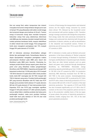 Laporan ManajemenManagement ReportProfil PerusahaanCompany ProfileAnalisa & Diskusi ManajemenManagement Discussion & AnalysisIkhtisar 20202020 HighlightsPT Pertamina Hulu Energi2020 Laporan Tahunan TerintegrasiIntegrated Annual Report 160In terms of final energy, the transportation and industrial sectors are the largest energy consumer by current share almost 70% followed by the household sector and commercial with portion ranging in 20%. Transition energy in energy consumers will change the composition final energy needs that were previously dominated by fuelgas and coal,turned into electricity both through the penetration of electric vehicles, as well as electrification in the industrial and household sectors. Portion of electricity use will increase from 15% to up to 39% in the GT scenario in 2050.EBT in Indonesia is mainly used as Biofuels and power generation. In the future utilization of Biofuel projected to increase through blending of Biodiesel in Gasoiland fuel types and Bioethanol in Gasoline type fuels. Besides that, there are other biofuel products such as green diesel and green avtur produced through development Biorefinery by PERTAMINA. Renewable energy generating capacity potentially grow from 10 GW in 2019 to 150 GW in the GT scenario by 2050. For production electricity, NRE electricity increased from 48 TWH to 620 TWH in the same scenario. Generatingelectricity production The dominant EBT is produced by PLT Hidro and PLTP with a share of electricity production of 21% in the scenario MD and 32% in the GT scenario of the total electricity production. The capacity of PLTS and PLTB has also increased significantly up to 67 GW in the GT scenario at the end of the projection period, but due to due to the production volatility factor of the two types of power plants, the portion of electricity production is relatively smaller, ranging from 10% -15% of the total power generation production.TINJAUAN umumGeneral OverviewDari sisi energi final, sektor transportasi dan industri merupakan konsumen energi terbesar dengan porsi saat ini hampir 70% yang dilanjutkan oleh sektor rumah tangga dan komersial dengan porsi berkisar di 20-an%. Transisi energi di konsumen energi akan merubah komposisi kebutuhan energi final yang sebelumnya didominasi oleh BBM gas dan batubara, berubah menjadi listrik baik melalui penetrasi kendaraan listrik, maupun elektrifikasi di sektor industri dan rumah tangga. Porsi penggunaan listrik akan mengalami peningkatan dari 15% menjadi hingga 39% pada skenario GT di 2050. EBT di Indonesia utamanya dimanfaatkan sebagai Biofuel dan pembangkit listrik. Pemanfaatan Biofuel ke depan diproyeksikan mengalami peningkatan melalui pencampuran Biodiesel pada BBM jenis Gasoil dan Bioethanol pada BBM jenis Gasoline. Disamping itu, terdapat produk Biofuel lainnya seperti green diesel dan green avtur yang dihasilkan melalui pengembangan Biorefinery oleh PERTAMINA. Kapasitas pembangkit EBT berpotensi tumbuh dari 10 GW pada tahun 2019 menjadi 150 GW di skenario GT pada tahun 2050. Untuk produksi listrik, listrik EBT meningkat dari 48 TWH menjadi 620 TWH di skenario yang sama. Produksi listrik pembangkit EBT yang dominan dihasilkan oleh PLT Hidro dan PLTP dengan porsi produksi listrik sebesar 21% pada skenario MD dan 32% pada skenario GT dari total produksi listrik. Kapasitas PLTS dan PLTB juga meningkat signifikan hingga 67 GW pada skenario GT akhir periode proyeksi, namun akibat faktor volatilitas produksi dari kedua jenis pembangkit tersebut, maka porsi produksi listriknya relatif lebih kecil yaitu berkisar di 10%-15% dari total produksi pembangkit listrik.Sumber : Pertamina Energi Outlook - PEOSource : Pertamina Energi Outlook - PEO