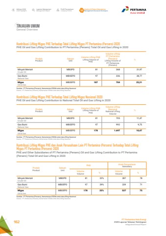 Laporan ManajemenManagement ReportProfil PerusahaanCompany ProfileAnalisa & Diskusi ManajemenManagement Discussion & AnalysisIkhtisar 20202020 HighlightsPT Pertamina Hulu Energi2020 Laporan Tahunan TerintegrasiIntegrated Annual Report 162TINJAUAN umumGeneral OverviewProdukProductSatuanUnitVolume Lifting PHELifting Volume of PHEVolume LiftingPT Pertamina (Persero)Lifting Volume of PT Pertamina (Persero)%Minyak MentahCrude OilMBOPD 81 368 21,97Gas BumiNatural GasMBOEPD 97 336 28,77MigasOil & GasMBOEPD 187 704 25,21Kontribusi Lifting Migas PHE Terhadap Total Lifting Migas PT Pertamina (Persero) 2020PHE Oil and Gas Lifting Contribution to PT Pertamina (Persero) Total Oil and Gas Lifting in 2020Sumber : PT Pertamina (Persero), Kementerian ESDM untuk data lifting NasionalSource : PT Pertamina (Persero), Kementerian ESDM untuk data lifting NasionalProdukProductSatuanUnitVolume Lifting PHELifting Volume of PHEVolume LiftingNasionalNational Lifting Volume%Minyak MentahCrude OilMBOPD 81 705 11,47Gas BumiNatural GasMBOEPD 97 992 9,75MigasOil & GasMBOEPD 178 1.697 10,47Kontribusi Lifting Migas PHE Terhadap Total Lifting Migas Nasional 2020PHE Oil and Gas Lifting Contribution to National Total Oil and Gas Lifting in 2020Sumber : PT Pertamina (Persero), Kementerian ESDM untuk data lifting NasionalSource : PT Pertamina (Persero), Kementerian ESDM untuk data lifting NasionalKontribusi Lifting Migas PHE dan Anak Perusahaan Lain PT Pertamina (Persero) Terhadap Total Lifting Migas PT Pertamina (Persero) 2020PHE and Other Subsidiaries of PT Pertamina (Persero) Oil and Gas Lifting Contribution to PT Pertamina (Persero) Total Oil and Gas Lifting in 2020ProdukProductSatuanUnitPHE Anak PerusahaanSubsidiaryVolumeVolume % VolumeVolume %Minyak MentahCrude OilMBOPD 81 22% 287 78Gas BumiNatural GasMBOEPD 97 29% 239 71MigasOil & GasMBOEPD 178 25% 527 75Sumber : PT Pertamina (Persero), Kementerian ESDM untuk data lifting NasionalSource : PT Pertamina (Persero), Kementerian ESDM untuk data lifting Nasional