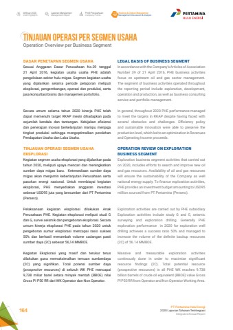 TINJAUAN OPERASI PER SEGMEN USAHA Operation Overview per Business SegmentLaporan ManajemenManagement ReportProfil PerusahaanCompany ProfileAnalisa & Diskusi ManajemenManagement Discussion & AnalysisIkhtisar 20202020 HighlightsPT Pertamina Hulu Energi2020 Laporan Tahunan TerintegrasiIntegrated Annual Report 164LEGAL BASIS OF BUSINESS SEGMENTIn accordance with the Company%u2019s Articles of Association Number 39 of 21 April 2016, PHE business activities focus on upstream oil and gas sector management. The segment of business activities operated throughout the reporting period include exploration, development, operation and production, as well as business consulting service and portfolio management. In general, throughout 2020 PHE performance managed to meet the targets in RKAP despite having faced with several obstacles and challenges. Efficiency policy and sustainable innovation were able to preserve the production level, which led to an optimization in Revenues and Operating Income proceeds.OPERATION REVIEW ON EXPLORATION BUSINESS SEGMENTExploration business segment activities that carried out on 2020, includes efforts to search and improve new oil and gas resources. Availability of oil and gas resources will ensure the sustainability of the Company as well national energy supply. To finance exploration activities, PHE provides an investment budget amounting to USD95 million sourced from PT Pertamina (Persero).Exploration activities are carried out by PHE subsidiary Exploration activities include study G and G, seismic surveying and exploration drilling. Generally PHE exploration performance in 2020 for exploration well drilling achieves a success ratio 50% and managed to increase the volume of the definite backup resources (2C) of 56.14 MMBOE.Massive and measurable exploration activities continously done in order to maximize significant resource findings (2C). Total potential resource (prospective resources) in all PHE WK reaches 9.738 billion barrels of crude oil equivalent (BBOE) value Gross Pl P50 RR from Operator and Non Operator Working Area.DASAR PENETAPAN SEGMEN USAHASesuai Anggaran Dasar Perusahaan No.39 tanggal 21 April 2016, kegiatan usaha usaha PHE adalah pengelolaan sektor hulu migas. Segmen kegiatan usaha yang dijalankan selama periode pelaporan meliputi eksplorasi, pengembangan, operasi dan produksi, serta jasa konsultasi bisnis dan manajemen portofolio.Secara umum selama tahun 2020 kinerja PHE telah dapat memenuhi target RKAP meski dihadapkan pada sejumlah kendala dan tantangan. Kebijakan efisiensi dan penerapan inovasi berkelanjutan mampu menjaga tingkat produksi sehingga mengoptimalkan perolehan Pendapatan Usaha dan Laba Usaha.TINJAUAN OPERASI SEGMEN USAHA EKSPLORASIKegiatan segmen usaha eksplorasi yang dijalankan pada tahun 2020, meliputi upaya mencari dan meningkatkan sumber daya migas baru. Ketersediaan sumber daya migas akan menjamin keberlanjutan Perusahaan serta pasokan energi nasional. Untuk membiayai kegiatan eksplorasi, PHE menyediakan anggaran investasi sebesar USD95 juta yang bersumber dari PT Pertamina (Persero). Pelaksanaan kegiatan eksplorasi dilakukan Anak Perusahaan PHE. Kegiatan eksplorasi meliputi studi G dan G, survei seismik dan pengeboran eksplorasi. Secara umum kinerja eksplorasi PHE pada tahun 2020 untuk pengeboran sumur eksplorasi mencapai rasio sukses 50% dan berhasil menambah volume cadangan pasti sumber daya (2C) sebesar 56,14 MMBOE.Kegiatan Eksplorasi yang masif dan terukur terus dilakukan guna memaksimalkan temuan sumberdaya (2C) yang signifikan. Total potensi sumber daya (prospective resources) di seluruh WK PHE mencapai 9,738 miliar barel setara minyak mentah (BBOE) nilai Gross PI P50 RR dari WK Operator dan Non Operator.