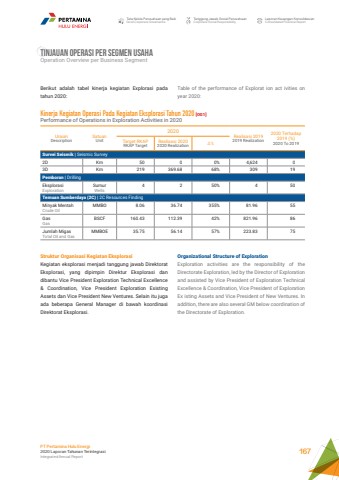 Tata Kelola Perusahaan yang BaikGood Corporate GovernanceTanggung Jawab Sosial PerusahaanCorporate Social ResponsibilityLaporan Keuangan KonsolidasianConsolidated Financial ReportPT Pertamina Hulu Energi2020 Laporan Tahunan TerintegrasiIntegrated Annual Report 167TINJAUAN OPERASI PER SEGMEN USAHA Operation Overview per Business SegmentTable of the performance of Explorat ion act ivities on year 2020:Organizational Structure of Exploration Exploration activities are the responsibility of the Directorate Exploration, led by the Director of Exploration and assisted by Vice President of Exploration Technical Excellence & Coordination, Vice President of Exploration Ex isting Assets and Vice President of New Ventures. In addition, there are also several GM below coordination of the Directorate of Exploration.Berikut adalah tabel kinerja kegiatan Explorasi pada tahun 2020:UraianDescriptionSatuanUnit2020Realisasi 20192019 Realization2020 Terhadap 2019 (%)2020 To 2019 Target RKAPRKAP TargetRealisasi 20202020 Realization %u2206%Survei Seismik | Seismic Survey2D Km 50 0 0% 4,624 03D Km 219 369.68 68% 309 19Pemboran | DrillingEksplorasi ExplorationSumurWells4 2 50% 4 50Temuan Sumberdaya (2C) | 2C Resources FindingMinyak MentahCrude OilMMBO 8.06 36.74 355% 81.96 55GasGasBSCF 160.43 112.39 42% 821.96 86Jumlah MigasTotal Oil and GasMMBOE 35.75 56.14 57% 223.83 75Kinerja Kegiatan Operasi Pada Kegiatan Eksplorasi Tahun 2020 [OG1]Performance of Operations in Exploration Activities in 2020Struktur Organisasi Kegiatan EksplorasiKegiatan eksplorasi menjadi tanggung jawab Direktorat Eksplorasi, yang dipimpin Direktur Eksplorasi dan dibantu Vice President Exploration Technical Excellence & Coordination, Vice President Exploration Existing Assets dan Vice President New Ventures. Selain itu juga ada beberapa General Manager di bawah koordinasi Direktorat Eksplorasi.