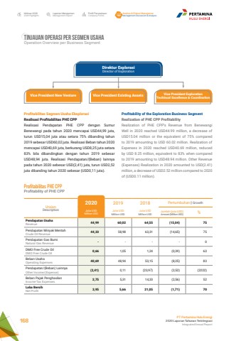 Laporan ManajemenManagement ReportProfil PerusahaanCompany ProfileAnalisa & Diskusi ManajemenManagement Discussion & AnalysisIkhtisar 20202020 HighlightsPT Pertamina Hulu Energi2020 Laporan Tahunan TerintegrasiIntegrated Annual Report 168Profitability of the Exploration Business SegmentRealization of PHE CPP ProfitabilityRealization of PHE CPP%u2019s Revenue from Benewangi Well in 2020 reached USD44.99 million, a decrease of USD15.04 million or the equivalent of 75% compared to 2019 amounting to USD 60.02 million. Realization of Expenses in 2020 reached USD40.69 million, reduced by USD 8.25 million, equivalent to 83% when compared to 2019 amounting to USD48.94 million. Other Revenue (Expenses) Realization in 2020 amounted to USD(2.41) million, a decrease of USD2.52 million compared to 2020 of (USD0.11 million).Direktur ExplorasiDirector of ExplorationVice President New Venture Vice President Existing Assets Vice President Exploration Techincal Excellence & CoordinationProfitabilitas Segmen Usaha EksplorasiRealisasi Profitabilitas PHE CPPRealisasi Pendapatan PHE CPP dengan Sumur Benewangi pada tahun 2020 mencapai USD44,99 juta, turun USD15,04 juta atau setara 75% dibanding tahun 2019 sebesar USD60,02 juta. Realisasi Beban tahun 2020 mencapai USD40,69 juta, berkurang USD8,25 juta setara 83% bila dibandingkan dengan tahun 2019 sebesar USD48,94 juta. Realisasi Pendapatan/(Beban) lainnya pada tahun 2020 sebesar USD(2,41) juta, turun USD2,52 juta dibanding tahun 2020 sebesar (USD0,11 juta). Profitabilitas PHE CPP Profitability of PHE CPPUraianDescription2020 2019 2018 Pertumbuhan | GrowthJuta USDMillion USDJuta USDMillion USDJuta USDMillion USDJumlah (juta USD)Amount (Million USD) %Pendapatan UsahaRevenue 44,99 60,02 64,55 (15,04) 75Pendapatan Minyak MentahCrude Oil Revenue 44,33 58,98 63,31 (14,65) 75Pendapatan Gas BumiNatural Gas Revenue - - - - 0DMO Free Crude OilDMO Free Crude Oil 0,66 1,05 1,24 (0,39) 63Beban UsahaOperating Expenses 40,69 48,94 53,15 (8,25) 83Pendapatan/(Beban) LainnyaOther Income/(Expense) (2,41) 0,11 (23,97) (2,52) (2222)Beban Pajak PenghasilanIncome Tax Expenses 2,75 5,31 14,33 (2,56) 52Laba BersihNet Profit 3,95 5,66 21,05 (1,71) 70TINJAUAN OPERASI PER SEGMEN USAHA Operation Overview per Business Segment