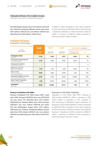 Laporan ManajemenManagement ReportProfil PerusahaanCompany ProfileAnalisa & Diskusi ManajemenManagement Discussion & AnalysisIkhtisar 20202020 HighlightsPT Pertamina Hulu Energi2020 Laporan Tahunan TerintegrasiIntegrated Annual Report 170of USD0.31 million, equivalent to 102% when compared to 2019 amounting to USD16.68 million. Other Revenue / (Expenses) realization in 2020 amounted to USD3.30 million, an increase of USD4.00 million compared to 2020 amounting to -USD0.70 million.Realization of PHE ONWJ ProfitabilityRealization of PHE ONWJ Well NWY-1 Revenue in 2020 reached USD485.63 million, a decrease of USD 160.95 million or equivalent to 75% compared to 2019 amounting to USD646.58 million. Realization of Expenses in 2020 reached USD395.27 million, a decrease of USD29.08 million, equivalent to 93% when compared to 2019 amounting to USD424.36 million. Other Realized Revenues / (Expenses) in 2020 amounted to USD40.21 million, a decrease of USD93.81 million compared to 2020 amounting to USD134.01 million.bila dibandingkan dengan tahun 2019 sebesar USD16,68 juta. Realisasi Pendapatan/(Beban) lainnya pada tahun 2020 sebesar USD3,30 juta, naik sebesar USD4,00 juta dibanding tahun 2020 sebesar -USD0,70 juta.Profitabilitas PHE Kampar Profitability of PHE KamparUraianDescription2020 2019 2018 Pertumbuhan | GrowthJuta USDMillion USDJuta USDMillion USDJuta USDMillion USDJumlah (juta USD)Amount (Million USD) %Pendapatan UsahaRevenue 11,94 16,40 14,97 (4,46) 73Pendapatan Minyak MentahCrude Oil Revenue 11,75 16,06 14,62 (4,31) 73Pendapatan Gas BumiNatural Gas Revenue - - - - 0DMO Free Crude OilDMO Free Crude Oil 0,18 0,34 0,35 (0,15) 55Beban UsahaOperating Expenses 16,99 16,68 16,84 0,31 102Pendapatan/(Beban) LainnyaOther Income/(Expense) (2,97) 13,46 (0,32) (16,43) (22)Beban Pajak PenghasilanIncome Tax Expenses 3,30 (0,70) (0,04) 4,00 (470)Laba BersihNet Profit (5,39) (13,05) (1,51) 7,66 41Realisasi Profitabilitas PHE ONWJRealisasi Pendapatan PHE ONWJ Sumur NWY-1 pada tahun 2020 mencapai USD485,63 juta, turun USD160,95 juta atau setara 75% dibanding tahun 2019 sebesar USD646,58 juta. Realisasi Beban tahun 2020 mencapai USD395,27 juta, turun sebesar USD29,08 juta setara 93% bila dibandingkan dengan tahun 2019 sebesar USD424,36 juta. Realisasi Pendapatan/(Beban) lainnya pada tahun 2020 sebesar USD40,21 juta, turun sebesar USD93,81 juta dibanding tahun 2020 sebesar USD134,01 juta.TINJAUAN OPERASI PER SEGMEN USAHA Operation Overview per Business Segment
