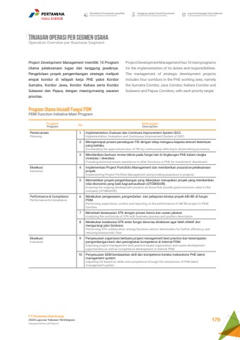 Tata Kelola Perusahaan yang BaikGood Corporate GovernanceTanggung Jawab Sosial PerusahaanCorporate Social ResponsibilityLaporan Keuangan KonsolidasianConsolidated Financial ReportPT Pertamina Hulu Energi2020 Laporan Tahunan TerintegrasiIntegrated Annual Report 179TINJAUAN OPERASI PER SEGMEN USAHA Operation Overview per Business SegmentProject Development Management has 10 main programs for the implementation of its duties and responsibilities. The management of strategic development projects includes four corridors in the PHE working area, namely the Sumatra Corridor, Java Corridor, Kaltara Corridor and Sulawesi and Papua Corridors, with each priority target.Project Development Management memiliki 10 Program Utama pelaksanaan tugas dan tanggung jawabnya. Pengelolaan proyek pengembangan strategis meliputi empat koridor di wilayah kerja PHE yakni Koridor Sumatra, Koridor Jawa, Koridor Kaltara serta Koridor Sulawesi dan Papua, dengan masing-masing sasaran prioritas.ProgramProgram No KeteranganDescriptionPerencanaan Planning1 Implementation, Evaluasi dan Continues Improvement System IDCC.Implementation, Evaluation and Continuous Improvement System of IDCC.2 Mempercepat proses persetujuan FID dengan tetap mengacu kepada seluruh ketentuan yang berlaku.Accelerating the approval process of FID by continuously referring to all prevailing provisions.3 Memberikan bantuan review teknis pada fungsi lain di lingkungan PHE dalam rangka investasi / divestasi.Providing technical review assistance in other functions in PHE for investment/ divestment.EksekusiExecution4 Implementasi Project Portofolio Management dan memberikan assurance pelaksanaan proyek.Implementing Project Portfolio Management and providing assurance in projects.5 Memastikan proyek pengembangan yang dikerjakan merupakan proyek yang memberikan nilai ekonomis yang baik bagi perusahaan (OTOBOSOR).Ensuring the ongoing development projects as those that provide good economic value to the company (OTOBOSOR).Performance & CompliancePerformance & Compliance6 Melakukan pengawasan, pengendalian dan pelaporan kinerja proyek ABI BD di fungsi PDM.Performing supervision, control, and reporting on the performance of ABI BD project in PDM function.7 Menelaah kesesuaian STK dengan proses bisnis dan uraian jabatan.Analyzing the conformity of STK with business process and position description.8 Melakukan kolaborasi STK antar fungsi dana tau direktorat agar lebih efektif dan mengurangi jalur birokrasi.Performing STK collaboration among functions and/or directorates for further efficiency, and reducing bureaucratic flow.EksekusiExecution9 Penyesuaian organisasi berbasis project management best practice dan kesempatan pengembangan karir dan peningkatan kompetensi di internal PDM.Adjusting project management best practice based organization and career development opportunities as well as competence development in internal PDM.10 Penyesuaian SDM berdasarkan skill dan kompetensi melalui mekanisme PHE talent management system.Adjusting HC based on skills and competence through the mechanism of PHE talent management system.Program Utama Inisiatif Fungsi PDMPDM Function Initiative Main Program