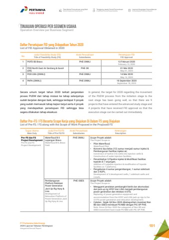 Tata Kelola Perusahaan yang BaikGood Corporate GovernanceTanggung Jawab Sosial PerusahaanCorporate Social ResponsibilityLaporan Keuangan KonsolidasianConsolidated Financial ReportPT Pertamina Hulu Energi2020 Laporan Tahunan TerintegrasiIntegrated Annual Report 181TINJAUAN OPERASI PER SEGMEN USAHA Operation Overview per Business SegmentIn general, the target for 2020 regarding the movement of the PUDW process from the initiation stage to the next stage has been going well, so that there are 9 projects that have entered the advanced study stage and 4 projects that have received FID approval so that the execution stage can be carried out immediately.No Judul Feasibility Study (FS)Title of Feasibility Study (FS)Anak PerusahaanSubsidiariesPersetujuan FIDFID Approval1 POFD B3 Bravo PHE ONWJ 13 Februari 2020February 13, 20202 POD North East Air Serdang & Guruh (OK)PHE OK 01 Mei 2020May 01, 20203 POD UXA (ONWJ) PHE ONWJ 14 Mei 2020May 14, 20204 PAPA (ONWJ) PHE ONWJ 18 September 2020September 18, 2020Daftar Persetujuan FID yang Didapatkan Tahun 2020List of FID Approval Obtained in 2020Secara umum target tahun 2020 terkait pergerakan proses PUDW dari tahap inisiasi ke tahap selanjutnya sudah berjalan dengan baik, sehingga terdapat 9 proyek yang sudah memasuki tahap kajian lanjut serta 4 proyek yang mendapatkan persetujuan FID sehingga bisa segera dilakukan tahap eksekusi. Daftar Pre-FS / FS Beserta Scope Kerja yang Diajukan Di Dalam FS yang DiajukanList of Pre-FS / FS along with the Scope of Work Proposed in the Proposed FSTugas UtamaMain DutyJudul Pre FS/FSTitle of Pre FS/FSAnak PerusahaanSubsidiariesKeteranganDescriptionPre-FS dan FS Project DevelopmentPre-FS and FS Project DevelopmentWaterflood B-3 Lapangan BravoWaterflood B-3, Bravo FieldPHE ONWJ Scope Proyek adalah:The Project Scope is:%u2022 Pilot Waterflood;Waterflood Pilot;%u2022 Konversi dua belas (12) sumur menjadi sumur injeksi & Pembangunan fasilitas injeksi air;Conversion of twelve (12) wells into injection wells & Construction of water injection facilities;%u2022 Penambahan 5 Pipeline injeksi & Modifikasi fasilitas topside di 7 anjungan;Addition of 5 pipeline injection & modification of topside facilities on 7 platforms;%u2022 Pengeboran 4 sumur pengembangan, 1 sumur sidetrackdan 2 KUPL.Development of 4 development wells, 1 sidetrack wells and 2 KUPL.Pembangunan Platform Relokasi Power Generation Jack Up Rig Hysy & LisaDevelopment of Relocation Platform of Power Generation Jack Up Rig Hysy & LisaPHE OSES Scope Proyek adalah:The Project Scope is:%u2022 Mengganti peralatan pembangkit listrik dan akomodasi dari jack up rig HYSY dan LISA menjadi pembangunan power generation dan relokasi 4 GTG;Replacing of power generation equipment and accommodation from the HYSY and LISA jack up rigs to the 4 GTG power generation and relocation development;%u2022 Catatan : Sejak Q4 Nov 2020 dikatagorilam investasi Non BD dan OSES membuat PS NBD dengan PIC OP PHE.Note: Since Q4 Nov 2020 the categories of Non BD and OSES investment have made PS NBD with PIC OP PHE.