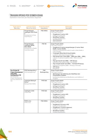 Laporan ManajemenManagement ReportProfil PerusahaanCompany ProfileAnalisa & Diskusi ManajemenManagement Discussion & AnalysisIkhtisar 20202020 HighlightsPT Pertamina Hulu Energi2020 Laporan Tahunan TerintegrasiIntegrated Annual Report 184Tugas UtamaMain DutyJudul Pre FS/FSTitle of Pre FS/FSAnak PerusahaanSubsidiariesKeteranganDescriptionPengembangan Lapangan Zulu Phase 2Development of Zulu Field Phase-2PHE ONWJ Scope Proyek adalah:The Project Scope is:%u2022 Pengeboran 5 sumur infill;Drilling of 5 infill wells;%u2022 Modifikasi Fasilitas;Facilities Modification;%u2022 Deck Extension.Deck Extension.Pengembangan Lapangan Badik/ West BadikDevelopment of Badik Field/West BadikPHE NC Scope Proyek adalah:The Project Scope is:%u2022 Pengeboran 8 sumur pengembangan (2 sumur West Badik, 6 sumur Badik);Drilling of 8 development wells (2 wells in West Badik, 6 wells in Badik);%u2022 3 anjungan (West/North/South Badik);3 platform (West/North/South Badik);%u2022 Pipa bawah laut 3 fase (NBA %u2013 WBA) dan (SBA %u2013 WBA);3 phase of submarine pipeline (NBA - WBA) and (SBA - WBA);%u2022 Pipa gas bawah laut (WBA %u2013 OPF Bunyu);Submarine Gas pipeline (WBA - OPF Bunyu);%u2022 Pipa minyak bawah laut (WBA %u2013 Terminal EP Bunyu);Submarine Oil pipeline (WBA - EP Bunyu Terminal);%u2022 OPF Bunyu.OPF Bunyu.Pre-FS dan FS Project Development yang telah mendapatkan FIDPre-FS and FS Project Development that has obtained the FIDPOD Randugunting 1POD Randugunting 1PHE RanduguntingScope Proyek adalah:The Project Scope is:%u2022 Membangun Gas Metering dan Modifikasi dan Penambahan Fasilitas.Building Gas Metering and Modification and Addition of Facilities.Lapangan Batang 8 Sumur Batang Field 8 WellsPHE Siak Scope Proyek adalah:The Project Scope is:%u2022 Pengeboran 8 sumur infill;Drilling of 8 infill wells;%u2022 Modifikasi Fasilitas.Facilities Modification.Lapangan Lindai Lindai FieldPHE Siak Scope Proyek adalah:The Project Scope is:%u2022 Pengeboran 3 sumur infill;Drilling of 3 infill wells;%u2022 Modifikasi Fasilitas.Facilities Modification.POFD LimaPOFD LimaPHE ONWJ Scope Proyek adalah:The Project Scope is:%u2022 Pengeboran 34 sumur infill;Drilling of 34 infill wells;%u2022 Pengeboran 12 Sumur Workover;Drilling of 12 workover wells;%u2022 Modifikasi Fasilitas.Facilities Modification.TINJAUAN OPERASI PER SEGMEN USAHA Operation Overview per Business Segment