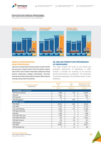 Tata Kelola Perusahaan yang BaikGood Corporate GovernanceTanggung Jawab Sosial PerusahaanCorporate Social ResponsibilityLaporan Keuangan KonsolidasianConsolidated Financial ReportPT Pertamina Hulu Energi2020 Laporan Tahunan TerintegrasiIntegrated Annual Report 19Anak PerusahaanSubsidiariesMinyakOilGasGasMinyak Setara GasOil Equivalent to GasBOPD MMSCFD BOEPDJoint Operator | Joint OperatorPHE Tomori Sulawesi 3.898 165 32.381PHE CPP 4.541 0 4.541PHE Salawati 362 1 537PHE Simenggaris 0 0,03 5Operator | OperatorPHE ONWJ 28.816 89,4 44.246PHE WMO 2.357 78 15.729PHE Jambi Merang 4.534 101 21.986PHE Ogan Komering 1.446 5 2.341PHE Siak 1.698 0 1.698PHE Tuban East Java 1.096 2 1.437PHE NSB & PHE NSO 820 80 14.633PHE Raja Tempirai 418 0,6 521PHE Kampar 1.041 0 1.041PHE OSES 25.832 79 39.477PHE Randugunting 4 1,4 254264 264 22.557 208 208290 293 25.31828.196 21428229.60620525.2102052016 2017 2018 2019 2020 2016 2017 2018 2019 2020 2016 2017 2018 2019 2020Produksi Gas (BSCF) Gas Production (BSCF)Lifting Minyak (MBO) Oil Lifting (MBO)Lifting Gas (BSCF)Gas Lifting (BSCF)IKHTISAR DATA KINERJA OPERASIONALOperational Performance Data HighlightsKINERJA PRODUKSI MIGASANAK PERUSAHAANLaporan ini menyertakan kinerja produksi minyak mentah dan gas bumi (migas) Entitas Anak Perusahaan selama tahun 2020, namun tidak menyertakan pelaporan kinerja periode sebelumnya sebagai pembanding. Informasi tentang hal tersebut disampaikan terpisah dalam laporan masing-masing Anak Perusahaan.OIL AND GAS PRODUCTION PERFORMANCE OF SUBSIDIARIESThis report includes the crude oil and natural gas production performance of Subsidiaries in 2020; however, it excludes the reporting of the previous period%u2019s performance as comparison. The information is presented separately in the individual reports of each Subsidiary.