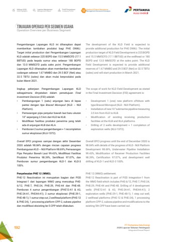 Laporan ManajemenManagement ReportProfil PerusahaanCompany ProfileAnalisa & Diskusi ManajemenManagement Discussion & AnalysisIkhtisar 20202020 HighlightsPT Pertamina Hulu Energi2020 Laporan Tahunan TerintegrasiIntegrated Annual Report 192TINJAUAN OPERASI PER SEGMEN USAHA Operation Overview per Business SegmentThe development of the KLD Field is expected to provide additional production for PHE ONWJ. The initial production target of KLD Field Development is 225 BOPD and 15.5 MM5CFD (17.1 BBTUD) at the wellhead or 180 BOPD and 13.0 MMSCFD at the sales point. The KLD Field Development is expected to provide additional reserves of 1.67 MMBO and 29.5 BCF (Net) or 32.5 TBTU (sales) and will start production in March 2021. The scope of work for KLD Field Development as stated in the Final Investment Decision (FID) agreement is:%u2022 Development 1 (one) new platform offshore with type Braced Monopod (KLD - NUI Platform).%u2022 Installation of new 10 %u201dsubmarine pipeline measuring 3.5 km from KLD to KLB.%u2022 Modification of existing receiving production facilities at the KLB and KLA platforms.%u2022 Drilling of 2 wells development + 1 completion of exploration wells (KLU-1ST2).Overall EPCI progress until the end of December 2020 is 98.84% with details of the progress of KLD - NUI Platform Development 98.69%, Underwater Pipeline Installation 99.43%, Modification of Receiver Production Facilities 98.39%, Certification 97.07%, and development well drilling of KLD-1 and KLD-3 100%.PHE 12 (WMO) settlement.PHE-12 Reactivation is part of POD Integration-1 from the WMO field which includes PHE-6/12, PHE-7, PHE-24, PHE-29, PHE-44 and PHE-48. Drilling of 4 development wells (PHE12-A1 & A3, PHE-24-A1, PHE44-A1); 2 exploration wells (PHE-29-1, PHE-48-1); 1 step out well, 2 wellhead platforms (PHE-12 & PHE-24), 1 processing platform CPP-2, subsea pipeline and modifications to the existing 5th CPP have been carried out.Pengembangan Lapangan KLD ini diharapkan dapat memberikan tambahan produksi bagi PHE ONWJ. Target initial production dari Pengembangan Lapangan KLD adalah sebesar 225 BOPD dan 15.5 MM5CFD (17.1 BBTUD) pada kepala sumur atau sebesar 180 BOPD dan 13.0 MMSCFD pada sales point. Pengembangon Lapangan KLD diharapkan akan memberikan tambahan cadangan sebesar 1.67 MMBO dan 29.5 BCF (Net) atau 32.5 TBTU (sales) dan akan mulai berproduksi pada bulan Maret 2021.lingkup pekerjaan Pengembangan Lapangan KLD sebagaimana dinyatakan dalam persetujuan Final Investment Decision (FID) adalah:%u2022 Pembangungan 1 (satu) anjungan baru di lepas pantai dengan tipe Braced Monopod (KLD %u2013 NUI Platform).%u2022 Pemasangan pipa penyalur bawah laut baru ukuran 10%u201d sepanjang 3.5 km dari KLD ke KLB.%u2022 Modifikasi fasilitas produksi penerima yang telah ada di anjungan KLB dan KLA.%u2022 Pemboran 2 sumur pengembangan + 1 recompletion sumur eksplorasi (KLU-1ST2).Overall EPCI progress sampai dengan akhir Desember 2020 adalah 98.84% dengan rincian capaian progress Pembangunan KLD %u2013 NUI Platform 98.69%, Pemasangan Pipa Penyalur Bawah Laut 99.43%, Modifikasi Fasilitas Produksi Penerima 98.39%, Sertifikasi 97.07%, dan Pemboran sumur pengembangan KLD-1 dan KLD-3 100%.Penyelesaian PHE 12 (WMO).PHE-12 Reactivation ini merupakan bagian dari POD Integrasi-1 dari lapangan WMO yang mencakup PHE6/12, PHE-7, PHE-24, PHE-29, PHE-44 dan PHE-48. Pemboran 4 sumur pengembangan (PHE12-A1 & A3, PHE-24-A1, PHE44-A1); 2 sumur eksplorasi (PHE-29-1, PHE-48-1); 1 sumur step out, 2 wellhead platform (PHE-12 & PHE-24), 1 processing platform CPP-2, subsea pipeline dan modifikasi eksisting ke-5 CPP telah dilakukan.