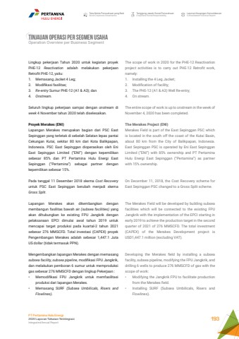 Tata Kelola Perusahaan yang BaikGood Corporate GovernanceTanggung Jawab Sosial PerusahaanCorporate Social ResponsibilityLaporan Keuangan KonsolidasianConsolidated Financial ReportPT Pertamina Hulu Energi2020 Laporan Tahunan TerintegrasiIntegrated Annual Report 193TINJAUAN OPERASI PER SEGMEN USAHA Operation Overview per Business SegmentThe scope of work in 2020 for the PHE-12 Reactivation project activities is to carry out PHE-12 Retrofit work, namely: 1. Installing the 4 Leg Jacket;2. Modification of facility;3. The PHE-12 (A1 & A3) Well Re-entry;4. On stream.The entire scope of work is up to onstream in the week of November 4, 2020 has been completed.The Merakes Project (ENI)Merakes Field is part of the East Sepinggan PSC which is located in the south off the coast of the Kutai Basin, about 80 km from the City of Balikpapan, Indonesia. East Sepinggan PSC is operated by Eni East Sepinggan Limited (%u201cENI%u201d) with 85% ownership and PT Pertamina Hulu Energi East Sepinggan (%u201cPertamina%u201d) as partner with 15% ownership.On December 11, 2018, the Cost Recovery scheme for East Sepinggan PSC changed to a Gross Split scheme. The Merakes Field will be developed by building subsea facilities which will be connected to the existing FPU Jangkrik with the implementation of the EPCI starting in early 2019 to achieve the production target in the second quarter of 2021 of 276 MMSCFD. The total investment (CAPEX) of the Merakes Development project is USD1,447.1 million (excluding VAT).Developing the Merakes field by installing a subsea facility, subsea pipeline, modifying the FPU Jangkrik, and drilling 6 wells to produce 276 MMSCFD of gas with the scope of work:%u2022 Modifying the Jangkrik FPU to facilitate production from the Merakes field.%u2022 Installing SURF (Subsea Umbilicals, Risers and Flowlines).Lingkup pekerjaan Tahun 2020 untuk kegiatan proyek PHE-12 Reactivation adalah melakukan pekerjaan Retrofit PHE-12, yaitu: 1. Memasang Jacket 4 Leg;2. Modifikasi fasilitas;3. Re-entry Sumur PHE-12 (A1 & A3); dan4. Onstream.Seluruh lingkup pekerjaan sampai dengan onstream di week 4 November tahun 2020 telah diselesaikan.Proyek Merakes (ENI)Lapangan Merakes merupakan bagian dari PSC East Sepinggan yang terletak di sebelah Selatan lepas pantai Cekungan Kutai, sekitar 80 km dari Kota Balikpapan, Indonesia. PSC East Sepinggan dioperasikan oleh Eni East Sepinggan Limited (%u201cENI%u201d) dengan kepemilikan sebesar 85% dan PT Pertamina Hulu Energi East Sepinggan (%u201cPertamina%u201d) sebagai partner dengan kepemilikan sebesar 15%.Pada tanggal 11 Desember 2018 skema Cost Recovery untuk PSC East Sepinggan berubah menjadi skema Gross Split. Lapangan Merakes akan dikembangkan dengan membangun fasilitas bawah air (subsea facilities) yang akan dihubungkan ke existing FPU Jangkrik dengan pelaksanaan EPCI dimulai awal tahun 2019 untuk mencapai target produksi pada kuartal-2 tahun 2021 sebesar 276 MMSCFD. Total investasi (CAPEX) proyek Pengembangan Merakes adalah sebesar 1,447.1 Juta US dollar (tidak termasuk PPN).Mengembangkan lapangan Merakes dengan memasang subsea facility, subsea pipeline, modifikasi FPU Jangkrik, dan melakukan pemboran 6 sumur untuk memproduksi gas sebesar 276 MMSCFD dengan lingkup Pekerjaan :%u2022 Memodifikasi FPU Jangkrik untuk memfasilitasi produksi dari lapangan Merakes.%u2022 Memasang SURF (Subsea Umbilicals, Risers and Flowlines).
