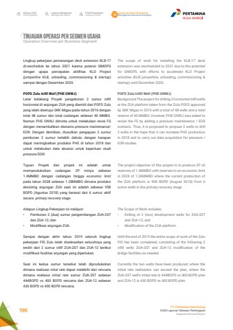 Laporan ManajemenManagement ReportProfil PerusahaanCompany ProfileAnalisa & Diskusi ManajemenManagement Discussion & AnalysisIkhtisar 20202020 HighlightsPT Pertamina Hulu Energi2020 Laporan Tahunan TerintegrasiIntegrated Annual Report 196TINJAUAN OPERASI PER SEGMEN USAHA Operation Overview per Business SegmentThe scope of work for installing the KLB-17 deck extension was rescheduled to 2021 due to the potential for SIMOPS with efforts to accelerate KLD Project activities (KLB jumperline, unloading, commissioning & startup) until December 2020.POFD Zulu Infill Well (PHE ONWJ)Background The project for drilling 2 horizontal infill wells at the ZUA platform taken from the Zulu POFD approved by SKK Migas in 2016 with a total of 48 wells and a total reserve of 40 MMBO. However, PHE ONWJ was asked to revise the FS by adding a pressure maintenance / EOR scenario. Thus, it is proposed to propose 2 wells to drill 2 wells in the hope that it can increase PHE production in 2018 and to carry out data acquisition for pressure / EOR studies.The project objective of this project is to produce 2P oil reserves of 1.4MMBO with reserves to an economic limit in 2028 of 1.28MMBO where the current production of the ZUA platform is 958 BOPD (August 2018) from 6 active wells in the primary recovery stage.The Scope of Work includes:%u2022 Drilling of 2 (two) development wells for ZUA-2ST and ZUA-12; and%u2022 Modification of the ZUA platform.Until the end of 2019 the entire scope of work of the Zulu FID has been completed, consisting of the following 2 infill wells ZUA-2ST and ZUA-12 modification of the bridge facilities as needed.Currently the two wells have been produced, where the initial rate realization can exceed the plan, where the ZUA-2ST well%u2019s initial rate is 444BOPD vs 400 BOPD plan and ZUA-12 is 430 BOPD vs 400 BOPD plan.Lingkup pekerjaan pemasangan deck extension KLB-17 di-reschedule ke tahun 2021 karena potensi SIMOPS dengan upaya percepatan aktifitas KLD Project (jumperline KLB, unloading, commissioning & startup) sampai dengan Desember 2020.POFD Zulu Infill Well (PHE ONWJ)Latar belakang Proyek pengeboran 2 sumur infillhorizontal di anjungan ZUA yang diambil dari POFD Zulu yang telah disetujui SKK Migas pada tahun 2016 dengan total 48 sumur dan total cadangan sebesar 40 MMBO. Namun PHE ONWJ diminta untuk melakukan revisi FS dengan menambahkan skenario pressure maintenance/EOR. Dengan demikian, diusulkan pengajuan 2 sumur pemboran 2 sumur terlebih dahulu dengan harapan dapat meningkatkan produksi PHE di tahun 2018 dan untuk melakukan data akuisisi untuk keperluan studi pressure/EOR.Tujuan Proyek dari proyek ini adalah untuk memproduksikan cadangan 2P minya sebesar 1.4MMBO dengan cadangan hingga economic limitpada tahun 2028 sebesar 1.28MMBO dimana produksi eksisting anjungan ZUA saat ini adalah sebesar 958 BOPD (Agustus 2018) yang berasal dari 6 sumur aktif secara primary recovery stage.Adapun Lingkup Pekerjaan ini meliputi:%u2022 Pemboran 2 (dua) sumur pengembangan ZUA-2ST dan ZUA-12; dan%u2022 Modifikasi anjungan ZUA.Sampai dengan akhir tahun 2019 seluruh lingkup pekerjaan FID Zulu telah diselesaikan seluruhnya yang terdiri dari 2 sumur infill ZUA-2ST dan ZUA-12 berikut modifikasi fasilitas anjungan yang diperlukan.Saat ini kedua sumur tersebut telah diproduksikan dimana realisasi intial rate dapat melebihi dari rencana dimana realisasi initial rate sumur ZUA-2ST sebesar 444BOPD vs 400 BOPD rencana dan ZUA-12 sebesar 430 BOPD vs 400 BOPD rencana.