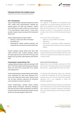 Laporan ManajemenManagement ReportProfil PerusahaanCompany ProfileAnalisa & Diskusi ManajemenManagement Discussion & AnalysisIkhtisar 20202020 HighlightsPT Pertamina Hulu Energi2020 Laporan Tahunan TerintegrasiIntegrated Annual Report 198TINJAUAN OPERASI PER SEGMEN USAHA Operation Overview per Business SegmentPOD-1 RanduguntingThe objective of developing the Randugunting field through POD-1 is to produce reserves. proven gas of 4.91 BSCF and condensate of 54.81 MSTB of 2P risked 6.3 BSCF and recovery factor of 77.4%, which is carried out through a scenario of 1 (one) production well with the concept of Gas in the form of CNG (Compressed Natural Gas). The scope of work for this project is:%u2022 Workover 1 (one) well RGT-2 & Complete;%u2022 FEED Study;%u2022 Construction of production facilities (separators, tank storage and gas metering as well as supporting utilities).Work progress until the end of 2020 has reached 100%, progress of facility work and the drilling of the RGT-2 well as well as for project Start-Up activities was carried out in February 2020.Batang-Siak Field Development Batang Field is one of the fields in the Siak CA PT PHE Siak, located in the Batang Block, Rokan Hilir Regency, Riau Province. , approximately 40 km north of Duri field. The Batang Field development project was submitted to obtain FID in September 2017 but was discontinued because there was no sole risk clause in the Unitization Agreement and it was suggested to Amend the Unitization Agreement. The Batang Field Development Project was re-submitted with full financing to be borne by PHE Siak (Sole Risk) after obtaining the Unitization Agreement Amendment which was made containing a sole risk clause on March 21, 2018.POD-1 RanduguntingTujuan Pengembangan lapangan Randugunting melalui POD-1 adalah untuk memproduksikan cadangan gas terbukti sebesar 4.91 BSCF dan kondensat sebesar 54.81 MSTB dari 2P risked 6.3 BSCF dan recovery factor 77.4%, yang dilakukan melalui skenario 1 (satu) sumur produksi dengan konsep Gas berupa CNG (Compressed Natural Gas). Adapun lingkup pekerjaan proyek ini adalah :%u2022 Workover 1 (satu) sumur RGT-2 & Komplesi;%u2022 Studi FEED; dan%u2022 Pembangunan Fasilitas produksi (separator, tank storage dan gas metering serta utilitas pendukung).Progress pekerjaan sampai dengan akhir tahun 2020 sudah mencapai 100%, progress pekerjaan fasilitas dan begitu juga pemboran sumur RGT-2 dan juga untuk kegiatan Start-Up proyek sudah dilakukan pada Februari 2020.Pengembangan Lapangan Batang%u2014SiakLapangan Batang merupakan salah satu lapangan di WK Siak PT PHE Siak, terletak pada Blok Batang, Kabupaten Rokan Hilir provinsi Riau, kurang lebih 40 km sebelah utara lapangan Duri. Proyek pengembangan Lapangan Batang telah diajukan untuk memperoleh FID pada bulan September 2017 namun tidak dilanjutkan karena belum adanya klausal sole risk pada Unitization Agreement dan disarankan untuk Amandemen Unitization Agreement. Proyek Pengembangan Lapangan Batang diajukan kembali dengan pembiayaan sepenuhnya ditanggung PHE Siak (Sole Risk) setelah mendapatkan Amandemen Unitization Agreement yang telah dibuat dengan memuat klausal sole risk pada tanggal 21 Maret 2018.