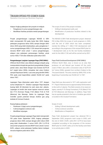 Laporan ManajemenManagement ReportProfil PerusahaanCompany ProfileAnalisa & Diskusi ManajemenManagement Discussion & AnalysisIkhtisar 20202020 HighlightsPT Pertamina Hulu Energi2020 Laporan Tahunan TerintegrasiIntegrated Annual Report 202TINJAUAN OPERASI PER SEGMEN USAHA Operation Overview per Business SegmentThe scope of work of this project includes: %u2022 Drilling 6 development wells; and%u2022 Modification of production facilities related to the development.The NEASD & GRH Field development project obtained FID in May 2020, the scope of work prognosis in 2020, until the end of 2020 which has been completed, namely the drilling of 1 ASDJ-113X development well according to the progonosa of the revised RKAP plan for 1 development well, as for the rest Facility installation work for the ASDJ-113X well will be carried out by 2021.Papa Field Continued Development (PHE ONWJ)Offshore North West Java is known as an area that produces oil and Natural gas located off the north coast of West Java with a concession area of 8,279.29 km2 (since 2006), spreads from northern Cirebon to the Thousand Islands. The area owned by ONWJ PSC at the beginning of ownership was 55,436 km2 in 1967.Papa field was discovered in 1971 with exploration well P-1. Papa%u2019s Field structure is approximately 40 kilometers to the north of Jakarta. This field consists of six reservoir layers, namely P-15 (Parigi Formation), P-20 (Main) P-26 & P-29 (Massive) and Baturaja. In addition, Papa Field has an upside potential in the form of shallow gas which is located in the Cisubuh Formation.Scope of work:%u2022 Drilling 3 (three) development wells%u2022 5 (five) workover activities %u2022 Modification of theplatformPapa Field development project has obtained FID in September 2020, prognosis work scope in 2020, until the end of 2020 2 KUPL wells (PA-1 & PF-4) have been completed according to the prognosis of the revision RKAP plan for 2 KUPL wells, as for the facility work there is no activity plan in 2020.Adapun lingkup pekerjaan dari proyek ini meliputi: %u2022 Pengeboran 6 sumur pengembangan; dan%u2022 Modifikasi fasilitas produksi terkait pengembanganProyek pengembangan Lapangan NEASD & GRH telah memperoleh FID pada bulan Mei 2020, lingkup pekerjaan progonosa tahun 2020, sampai dengan akhir tahun 2020 yang telah diselesaikan, yaitu pengeboran 1 sumur pengembangan ASDJ-113X sesuai dari prognosa rencana RKAP revisi untuk 1 sumur pengembangan, adapun sisa pekerjaan pemasangan fasilitas untuk sumur ASDJ-113X akan dilakukan pada tahun 2021.Pengembangan Lanjutan Lapangan Papa (PHE ONWJ)Offshore North West Java dikenal sebagai wilayah yang memproduksi minyak dan gas bumi yang terletak di lepas pantai utara Jawa Barat dengan luas konsesi 8,279.29 km2 (sejak tahun 2006), menyebar dari utara Cirebon sampai Kepulauan Seribu. Luas area yang dimiliki ONWJ PSC pada awal kepemilikan adalah 55,436 km2 pada tahun 1967.Lapangan Papa ditemukan pada tahun 1971 dengan sumur eksplorasi P-1. Struktur Lapangan Papa berjarak kurang lebih 40 kilometer ke arah utara dari Jakarta. Lapangan ini terdiri dari enam lapisan reservoir antara lain P-15 (Formasi Parigi), P-20 (Main) P-26 & P-29 (Massive) dan Baturaja. Selain itu Lapangan Papa memiliki upside potential berupa shallow gas yang terletak di Formasi Cisubuh.Ruang lingkup pekerjaan :%u2022 Pemboran 3 (tiga) sumur pengembangan;%u2022 5 (lima) kegiatan workover; dan%u2022 Modifikasi anjungan.Proyek pengembanga Lapangan Papa telah memperoleh FID pada bulan September 2020, lingkup pekerjaan prognosa tahun 2020, sampai dengan akhir tahun 2020 yang telah diselesaikan 2 sumur KUPL (PA-1 & PF-4) sesuai dari prognosa rencana RKAP revisi untuk 2 sumur KUPL, adapun untuk pekerjaan fasilitas belum terdapat rencana kegiatan pada tahun 2020.