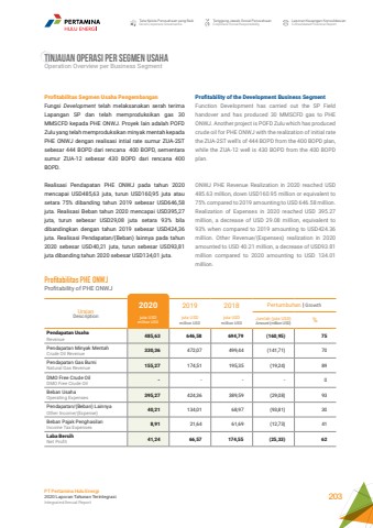 Tata Kelola Perusahaan yang BaikGood Corporate GovernanceTanggung Jawab Sosial PerusahaanCorporate Social ResponsibilityLaporan Keuangan KonsolidasianConsolidated Financial ReportPT Pertamina Hulu Energi2020 Laporan Tahunan TerintegrasiIntegrated Annual Report 203Profitability of the Development Business SegmentFunction Development has carried out the SP Field handover and has produced 30 MMSCFD gas to PHE ONWJ. Another project is POFD Zulu which has produced crude oil for PHE ONWJ with the realization of initial rate the ZUA-2ST well%u2019s of 444 BOPD from the 400 BOPD plan, while the ZUA-12 well is 430 BOPD from the 400 BOPD plan. ONWJ PHE Revenue Realization in 2020 reached USD 485.63 million, down USD160.95 million or equivalent to 75% compared to 2019 amounting to USD 646.58 million. Realization of Expenses in 2020 reached USD 395.27 million, a decrease of USD 29.08 million, equivalent to 93% when compared to 2019 amounting to USD424.36 million. Other Revenue/(Expenses) realization in 2020 amounted to USD 40.21 million, a decrease of USD93.81 million compared to 2020 amounting to USD 134.01 million.TINJAUAN OPERASI PER SEGMEN USAHA Operation Overview per Business SegmentProfitabilitas Segmen Usaha PengembanganFungsi Development telah melaksanakan serah terima Lapangan SP dan telah memproduksikan gas 30 MMSCFD kepada PHE ONWJ. Proyek lain adalah POFD Zulu yang telah memproduksikan minyak mentah kepada PHE ONWJ dengan realisasi intial rate sumur ZUA-2ST sebesar 444 BOPD dari rencana 400 BOPD, sementara sumur ZUA-12 sebesar 430 BOPD dari rencana 400 BOPD. Realisasi Pendapatan PHE ONWJ pada tahun 2020 mencapai USD485,63 juta, turun USD160,95 juta atau setara 75% dibanding tahun 2019 sebesar USD646,58 juta. Realisasi Beban tahun 2020 mencapai USD395,27 juta, turun sebesar USD29,08 juta setara 93% bila dibandingkan dengan tahun 2019 sebesar USD424,36 juta. Realisasi Pendapatan/(Beban) lainnya pada tahun 2020 sebesar USD40,21 juta, turun sebesar USD93,81 juta dibanding tahun 2020 sebesar USD134,01 juta.Profitabilitas PHE ONWJ Profitability of PHE ONWJUraianDescription2020 2019 2018 Pertumbuhan | Growthjuta USDmillion USDjuta USDmillion USDjuta USDmillion USDJumlah (juta USD)Amount (million USD) %Pendapatan UsahaRevenue 485,63 646,58 694,79 (160,95) 75Pendapatan Minyak MentahCrude Oil Revenue 330,36 472,07 499,44 (141,71) 70Pendapatan Gas BumiNatural Gas Revenue 155,27 174,51 195,35 (19,24) 89DMO Free Crude OilDMO Free Crude Oil - - - - 0Beban UsahaOperating Expenses 395,27 424,36 389,59 (29,08) 93Pendapatan/(Beban) LainnyaOther Income/(Expense) 40,21 134,01 68,97 (93,81) 30Beban Pajak PenghasilanIncome Tax Expenses 8,91 21,64 61,69 (12,73) 41Laba BersihNet Profit 41,24 66,57 174,55 (25,33) 62