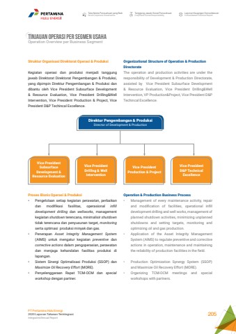 Tata Kelola Perusahaan yang BaikGood Corporate GovernanceTanggung Jawab Sosial PerusahaanCorporate Social ResponsibilityLaporan Keuangan KonsolidasianConsolidated Financial ReportPT Pertamina Hulu Energi2020 Laporan Tahunan TerintegrasiIntegrated Annual Report 205TINJAUAN OPERASI PER SEGMEN USAHA Operation Overview per Business SegmentOrganizational Structure of Operation & Production Directorate The operation and production activities are under the responsibility of Development & Production Directorate, assisted by Vice President Subsurface Development & Resource Evaluation, Vice President Drilling&Well Intervention, VP Production&Project, Vice President D&P Techincal Excellence.Operation & Production Business Process %u2022 Management of every maintenance activity, repair and modification of facilities, operational infill development drilling and well works, management of planned shutdown activities, minimizing unplanned shutdowns and setting targets, monitoring and optimizing oil and gas production.%u2022 Application of the Asset Integrity Management System (AIMS) to regulate preventive and corrective actions in operation, maintenance and maintaining the reliability of production facilities in the field.%u2022 Production Optimization Synergy System (SSOP) and Maximize Oil Recovery Effort (MORE).%u2022 Organizing TCM-OCM meetings and special workshops with partners.Struktur Organisasi Direktorat Operasi & Produksi Kegiatan operasi dan produksi menjadi tanggung jawab Direktorat Direktorat Pengembangan & Produksi, yang dipimpin Direktur Pengembangan & Produksi dan dibantu oleh Vice President Subsurface Development & Resource Evaluation, Vice President Drilling&Well Intervention, Vice President Production & Project, Vice President D&P Techincal Excellence.Direktur Pengembangan & ProduksiDirector of Development & ProductionVice President Subsurface Development & Resource EvaluationVice President Production & ProjectVice President Drilling & Well InterventionVice President D&P Technical ExcellenceProses Bisnis Operasi & Produksi%u2022 Pengelolaan setiap kegiatan perawatan, perbaikan dan modifikasi fasilitas, operasional infill development drilling dan wellworks, management kegiatan shutdown terencana, minimalisir shutdown tidak terencana dan penyusunan target, monitoring serta optimasi produksi minyak dan gas. %u2022 Penerapan Asset Integrity Management System (AIMS) untuk mengatur kegiatan preventive dan corrective actions dalam pengoperasian, perawatan dan menjaga kehandalan fasilitas produksi di lapangan.%u2022 Sistem Sinergi Optimalisasi Produksi (SSOP) dan Maximize Oil Recovery Effort (MORE).%u2022 Penyelenggaraan Rapat TCM-OCM dan special workshop dengan partner.
