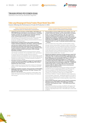Laporan ManajemenManagement ReportProfil PerusahaanCompany ProfileAnalisa & Diskusi ManajemenManagement Discussion & AnalysisIkhtisar 20202020 HighlightsPT Pertamina Hulu Energi2020 Laporan Tahunan TerintegrasiIntegrated Annual Report 210TINJAUAN OPERASI PER SEGMEN USAHA Operation Overview per Business SegmentFaktor yang Mempengaruhi Kinerja Produksi Minyak Mentah Tahun 2020Factors Affecting the Performance of Crude Oil Production in 2020Faktor Pendukung Pencapaian Kinerja Supporting Factor for Performance AchievementFaktor Penghambat Pencapaian KinerjaResistor Factor for Performance Achievement%u2022 Optimasi planned shutdown di PHE ONWJ, PHE WMO dan PHE OSES dengan percepatan durasi pekerjaan, modifikasi fasilitas produksi dan penggabungan beberapa aktivitas untuk mengurangi production losses potential.Optimization of planned shutdowns at PHE ONWJ, PHE WMO and PHE OSES by accelerating work duration, modifying production facilities and combining several activities to reduce production potential losses.%u2022 Keberhasilan menjaga decline rate produksi eksisting melalui akselerasi pekerjaan rekomplesi, optimasi kegiatan well services melalui intensif review dalam pemilihan kandidat dan penerapan teknologi baru (scale prevention) di sumur back bone producer, serta menjaga reliability serta optimasi fasilitas produksi permukaan untuk menjaga kestabilan produksi.The success of maintaining the existing production decline rate through acceleration of recomploration work, optimization of well services activities through intensive reviews in candidate selection and application of new technologies (scale prevention) in back bone producer wells, as well as maintaining reliability and optimization of surface production facilities to maintain production stability.%u2022 Perolehan kondensat yang lebih tinggi karena peningkatan serapan gas bumi pada PHE Jambi Merang, PHE Tomori Sulawesi dan PHE Corridor.Higher condensate recovery due to the increase of natural gas uptake in PHE Jambi Merang, PHE Tomori Sulawesi and PHE Corridor.%u2022 Upaya penambahan program well reactivation di PHE ONWJ, PHE OSES, PHE Ogan Komering, PHE Raja Tempirai, PHE Siak dan PHE Kampar.Efforts to add well reactivation programs at PHE ONWJ, PHE OSES, PHE Ogan Komering, PHE Raja Tempirai, PHE Siak and PHE Kampar.%u2022 Permasalahan sumuran (ESP down hole problem, Gas Lift problem, kebocoran tubing, sand & scale problem, kenaikan kadar air yang melebihin perkiraan, dll) dan unplanned shutdown fasilitas produksi (pipeline & riser leaks, power tripped, plant shutdown, compressor problem, back pressure, sludging) serta gangguan penyerapan gas akibat kegiatan tidak terencana (TAR PK, low demand industry selama pandemi Covid-19, Covid-19 outbreak & plant problem PAU %u2013 Tomori)Well issue (ESP down hole problem, Gas lift problem, tubing leakage, sand & scale problem, increase in water content that exceeds estimates, etc.) and unplanned shutdown of production facilities (pipeline & riser leaks, power tripped, plant shutdown, compressor problem, back pressure, sludging) and disruption of gas absorption due to unplanned activities (TAR PK, low demand industry during the Covid-19 pandemic, Covid-19 outbreak & plant problem PAU - Tomori)%u2022 Mundurnya eksekusi; pemboran pengembangan pada PHE OSES dan PHE TEJ karena permasalahan operasional dan persetujuan FID, workover program pada PHE OSES karena belum didapatkannya persetujuan FID: Krisna A-07/C-01 dan Evaluasi ulang subsurface Widuri H-10, delay startup Platform Reactivation WMO PHE-12 karena additional scope/engineering recommendation, delay ESP - PHE40A5R terkait proses farm-in contract HWU & E-line serta delay eksekusi NEB-25, NEB-29, NEB-65 karena keterbatasan operasi impact pandemi Cov19.Postponement of execution; development drilling at PHE OSES and PHE TEJ due to operational problems and FID approval, workover programs at PHE OSES because FID approval has not been obtained: Krisna A-07/C-01 and re-evaluation of Widuri H-10 subsurface, delay start-up of WMO PHE Reactivation Platform -12 due to additional scope/engineering recommendation, delay ESP - PHE40A5R related to the HWU & E-line farm-in contract process as well as delay in execution of NEB-25, NEB-29, NEB-65 due to limited operation impact of the Cov19 pandemic%u2022 Hasil produksi dibawah target sumuran RKAP di pemboran beberapa sumur PHE ONWJ, PHE OSES dan PHE Raja Tempirai, Field Reaktivasi Lidya %u2013 PHE OSES karena down hole problem.The result of produtions are below the RKAP well target in the drilling of several wells PHE ONWJ, PHE OSES and PHE Raja Tempirai, Lidya Reactivation Field - PHE OSES due to down hole problems