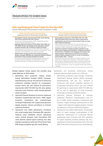 Tata Kelola Perusahaan yang BaikGood Corporate GovernanceTanggung Jawab Sosial PerusahaanCorporate Social ResponsibilityLaporan Keuangan KonsolidasianConsolidated Financial ReportPT Pertamina Hulu Energi2020 Laporan Tahunan TerintegrasiIntegrated Annual Report 211TINJAUAN OPERASI PER SEGMEN USAHA Operation Overview per Business SegmentFaktor yang Mempengaruhi Kinerja Produksi Gas Bumi Tahun 2020Factors Affecting the Performance of Gas Production in 2020Faktor Pendukung Pencapaian Kinerja Supporting Factor for Performance AchievementFaktor Penghambat Pencapaian KinerjaResistor Factor for Performance Achievement%u2022 Peningkatan serapan gas bumi pada PHE Jambi Merang, PHE Tomori Sulawesi dan PHE Corridor.Increase of natural gas uptake at PHE Jambi Merang, PHE Tomori Sulawesi and PHE Corridor%u2022 Optimasi planned shutdown di PHE ONWJ PHE OSES dan PHE WMO dengan percepatan durasi pekerjaan, operasi simultan/bersama dan modifikasi fasilitas produksi. Optimized planned shutdown at PHE ONWJ PHE OSES and PHE WMO with accelerated work duration, simultaneous / joint operation and modification of production facilities.%u2022 Keberhasilan menjaga decline rate produksi eksisting dengan menjaga reliability serta optimasi fasilitas produksi permukaan untuk menjaga kestabilan produksi. Success in maintaining the existing production decline rate by maintaining the reliability and optimization of surface production facilities to maintain production stability.%u2022 Permasalahan sumuran di PHE OSES, PHE TEJ, PHE NSO yang belum bisa di-recovery secara cepat karena keterbatasan rig well service dan kenaikan kadar air yang lebih tinggi dari perkiraan. Wells trouble in PHE WMO, PHE TEJ and PHE NSO which cannot be quickly recovery due to limited rig well service and an increase in water content that is higher than expected.%u2022 Unplanned shutdown fasilitas produksi (pipeline & riser leaks, power tripped, plant shutdown, compressor problem, back pressure, sludging) serta gangguan penyerapan gas akibat kegiatan tidak terencana (TAR PK, low demand industry selama pandemi Covid-19, Covid-19 outbreak & plant problem PAU %u2013 Tomori)Unplanned shutdown of production facilities (pipeline & riser leaks, power tripped, plant shutdown, compressor problems, back pressure, sludging) and disruption of gas absorption due to unplanned activities (TAR PK, low demand industry during the Covid-19 pandemic, Covid-19 outbreak & plant PAU problem - Tomori).Operational and production performance activity strategies that have been carried out in 2020 are:1. Maintaining production base through; Production Optimization Synergy System (SSOP) Campaign: Debottlenecking, well opt. Etc., Intensive & Continuous well service candidate selection for re-opening/re-activating shut-in and well artificial lift performance improvement (ESP, PCP, SRP, Gas lift) as well as application of Scale Prevention technology to maintain production decline.2. Optimized Planned Shutdown & minimize Unplanned Shutdown; Implementation and Golive of AIMS, regular preventive maintenance and overhaul / engine exchange, Implementation of TAR - regular and progressive pigging program, Improve surveillance to minimize unplanned shutdown.3. Operational Cost (ABO) Optimization; Prioritization plans for repair strategy, Implementation of RBI inspection, Optimization for conducting inhouse engineering works, Contracts with PHE subsidiary for typical operating activities (catering, fuel, etc.), substitution of electricity distribution from CPI to the BOB Power Plant with gas flow from Jambi Merang.Strategi kegiatan kinerja operasi dan produksi yang sudah dilakukan di 2020 adalah:1. Maintaining base production melalui; Sistem Sinergi Optimalisasi Produksi (SSOP) Campaign: Debottlenecking, well opt. Dll, Intensive & Continuous wellservice candidate selection for re-opening/reactivate shut-in dan well artificial lift performance improvement (ESP, PCP, SRP, Gas lift) serta aplikasi teknologi Scale Prevention untuk mempertahankan decline produksi.2. Optimized Planned Shutdown & minimize Unplanned Shutdown; Implementasi dan Go-live AIMS, regular preventive maintenance dan overhaul/engine exchange, Pelaksanaan TAR - regular and progressive pigging program, Improve surveillance to minimize unplanned shutdown.3. Operational Cost (ABO) Optimization; Prioritisasi plan untuk strategi repair, Penerapan RBI inspection, Optimasi untuk melakukan inhouse engineeringworks, Kontrak bersama Anak Perusahaan PHE untuk aktivitas operasi typical (catering, fuel, dsb), Substitusi penyaluran listrik dari CPI ke Power Plant BOB dengan pengaliran gas dari Jambi Merang
