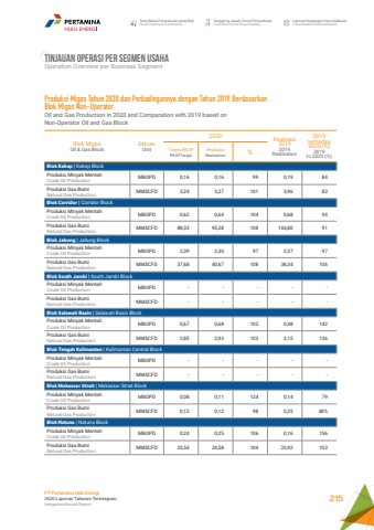 Tata Kelola Perusahaan yang BaikGood Corporate GovernanceTanggung Jawab Sosial PerusahaanCorporate Social ResponsibilityLaporan Keuangan KonsolidasianConsolidated Financial ReportPT Pertamina Hulu Energi2020 Laporan Tahunan TerintegrasiIntegrated Annual Report 215TINJAUAN OPERASI PER SEGMEN USAHA Operation Overview per Business SegmentBlok MigasOil & Gas BlockSatuanUnit2020 Realisasi 20192019 Realization2019 terhadap 2020 (%)2019 to 2020 (%)Target RKAPRKAPTargetRealisasiRealization %Blok Kakap | Kakap BlockProduksi Minyak MentahCrude Oil Production MBOPD 0,16 0,16 99 0,19 84Produksi Gas BumiNatural Gas Production MMSCFD 3,24 3,27 101 3,96 83Blok Corridor | Corridor BlockProduksi Minyak MentahCrude Oil Production MBOPD 0,62 0,64 104 0,68 94Produksi Gas BumiNatural Gas Production MMSCFD 88,33 95,28 108 104,80 91Blok Jabung | Jabung BlockProduksi Minyak MentahCrude Oil Production MBOPD 2,39 2,30 97 2,37 97Produksi Gas BumiNatural Gas Production MMSCFD 37,68 40,67 108 38,34 106Blok South Jambi | South Jambi BlockProduksi Minyak MentahCrude Oil Production MBOPD - - - - -Produksi Gas BumiNatural Gas Production MMSCFD - - - - -Blok Salawati Basin | Salawati Basin BlockProduksi Minyak MentahCrude Oil Production MBOPD 0,67 0,68 102 0,48 142Produksi Gas BumiNatural Gas Production MMSCFD 2,85 2,93 103 2,15 136Blok Tengah Kalimantan | Kalimantan Central BlockProduksi Minyak MentahCrude Oil Production MBOPD - - - - -Produksi Gas BumiNatural Gas Production MMSCFD - - - - -Blok Makassar Strait | Makassar Strait BlockProduksi Minyak MentahCrude Oil Production MBOPD 0,08 0,11 124 0,14 79Produksi Gas BumiNatural Gas Production MMSCFD 0,12 0,12 98 0,25 48%Blok Natuna | Natuna BlockProduksi Minyak MentahCrude Oil Production MBOPD 0,24 0,25 106 0,16 156Produksi Gas BumiNatural Gas Production MMSCFD 23,54 24,58 104 23,92 103Produksi Migas Tahun 2020 dan Perbadingannya dengan Tahun 2019 Berdasarkan Blok Migas Non-OperatorOil and Gas Production in 2020 and Comparation with 2019 based on Non-Operator Oil and Gas Block