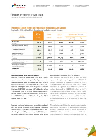 Tata Kelola Perusahaan yang BaikGood Corporate GovernanceTanggung Jawab Sosial PerusahaanCorporate Social ResponsibilityLaporan Keuangan KonsolidasianConsolidated Financial ReportPT Pertamina Hulu Energi2020 Laporan Tahunan TerintegrasiIntegrated Annual Report 219TINJAUAN OPERASI PER SEGMEN USAHA Operation Overview per Business SegmentProfitability of Oil and Gas Block as OperatorThe realization of revenue from oil and gas block operators during the reporting period was USD1,397.38 million, a decrease of USD363.03 million or 20.62% compared to 2019 which reached USD1,760.41 million. Realization of Expenses in 2020 became USD1,177.08 million, decreased by USD114.84 million or 8.89% compared to 2019 amounting to USD1,291.91 million. Other Revenue/(Expenses) realization in 2020 amounted to USD46.22 million, a decrease of USD33.32 million or 41.89% compared to 2019 amounting to USD79.54 million.The realization of profit from the operating and production segments of the operator%u2019s oil and gas blocks during the reporting period was USD82.32 million, a decrease of USD155.85 million or 65.44% compared to 2019 which reached USD238.16 million. Profit Acquisition from oil Profitabilitas Segmen Operasi dan Produksi Blok Migas Sebagai Joint OperatorProfitability of Oil and Gas Block Operation and Production as Join OperatorUraianDescription2020 2019 2018 Pertumbuhan | GrowthJuta USDMillion USDJuta USDMillion USDJuta USDMillion USDJumlah (juta USD)Amount (Million USD) %PendapatanRevenue 237,74 552,83 587,51 (315,09) (57,00)Pendapatan Minyak MentahCrude Oil Revenue 80,16 180,08 177,67 (100) (55,49)Pendapatan Gas BumiNatural Gas Revenue 147,64 354,17 379,43 (207) (58,31)DMO Free Crude OilDMO Free Crude Oil 9,93 18,57 30,41 (9) (46,53)BebanExpenses (119,32) (207,67) (201,19) 88,35 (42,54)Pendapatan/Beban LainnyaOther Income/Expense 7,70 (0,08) 24,70 7,78 (9.235,51)Beban Pajak PenghasilanIncome Tax Expenses (48,74) (131,40) (152,13) 83 (62,91)Laba BersihNet Profit 77,38 213,68 258,88 (136,29) (63,79)Profitabilitas Blok Migas Sebagai OperatorRealisasi perolehan Pendapatan dari blok migas operator selama kurun waktu periode pelaporan sebesar USD1.397,38 juta, turun USD363,03 juta atau 20,62% dibanding tahun 2019 yang mencapai USD1.760,41 juta. Realisasi Beban pada tahun 2020 menjadi USD1.177,08 juta, turun USD114,84 juta atau 8,89% dibanding tahun 2019 sebesar USD1.291,91 juta. Realisasi Pendapatan/(Beban) lainnya pada tahun 2020 sebesar USD46,22juta, turun USD33,32 juta atau 41,89% dibanding tahun 2019 sebesar USD79,54 juta.Realisasi perolehan Laba segmen operasi dan produksi dari blok migas operator selama periode pelaporan sebesar USD82,32 juta, turun USD155,85 juta atau 65,44% dibanding tahun 2019 yang mencapai USD238,16 juta. Perolehan Laba dari blok migas operator pada tahun