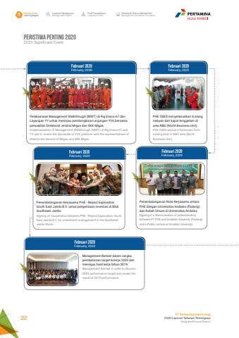 Laporan ManajemenManagement ReportProfil PerusahaanCompany ProfileAnalisa & Diskusi ManajemenManagement Discussion & AnalysisIkhtisar 20202020 HighlightsPT Pertamina Hulu Energi2020 Laporan Tahunan TerintegrasiIntegrated Annual Report 22Peristiwa Penting 20202020 Significant EventPHE OSES menyelamatkan 6 orang nelayan dari kapal tenggelam di area NBU (North Business Unit).PHE OSES rescue 6 fishermen from sinking boat in NBU area (North Business Unit).Penandatanganan Nota Kerjasama antara PHE dengan Universitas Andalas (Padang) dan Kuliah Umum di Universitas Andalas.Signing of a Memorandum of Understanding between PT PHE and Andalas University (Padang) and a Public Lecture at Andalas University.Management Retreat dalam rangka pembahasan target kinerja 2020 dan meninjau hasil kerja tahun 2019.Management Retreat in order to discuss 2020 performance target and review the result of 2019 performance.Pelaksanaan Management Walkthrough (MWT) di Rig Ensco-67 dan Lapangan YY untuk meninjau pembongkaran anjungan YYA bersama perwakilan Direktorat Jendral Migas dan SKK Migas.Implementation of Management Walkthrough (MWT) at Rig Ensco-67 and YY site to review the dismantle of YYA platform with the representatives of Directorate General of Migas and SKK Migas.Penandatanganan Kerjasama PHE - Repsol Exploration South East Jambi B.V. untuk pengelolaan investasi di Blok Southeast Jambi.Signing of Cooperation between PHE - Repsol Exploration South East Jambi B.V. for investment management in the Southeast Jambi Block.Februari 2020February, 2020Februari 2020February, 2020Februari 2020February, 2020Februari 2020February, 2020Februari 2020February, 2020