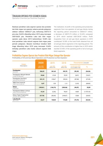 Tata Kelola Perusahaan yang BaikGood Corporate GovernanceTanggung Jawab Sosial PerusahaanCorporate Social ResponsibilityLaporan Keuangan KonsolidasianConsolidated Financial ReportPT Pertamina Hulu Energi2020 Laporan Tahunan TerintegrasiIntegrated Annual Report 221TINJAUAN OPERASI PER SEGMEN USAHA Operation Overview per Business SegmentThe realization of profit in the operating and production segments from non-operator oil and gas blocks during the reporting period amounted to USD64.27 million, a decrease of USD73.73 million or 53.43% compared to 2019 which reached USD138.00 million. Profit Acquisition from oil and gas block operators in 2019 contributed 10.90% of the total Profit obtained from all oil and gas block segments in the reporting period. The amount of this contribution is higher than in 2019 which reached 23.40% of the operating profit of all oil and gas block segments.Realisasi perolehan Laba segmen operasi dan produksi dari blok migas non-operator selama periode pelaporan sebesar sebesar USD64,27 juta, berkurang USD73,73 juta atau 53,43% dibanding tahun 2019 yang mencapai USD138,00 juta. Perolehan Laba dari blok migas operator pada tahun 2019 berkontribusi 10,90% dari total perolehan Laba seluruh segmen blok migas pada periode pelaporan. Besaran kontribusi tersebut lebih tinggi dibanding tahun 2019 yang mencapai 23,40% terhadap perolehan Laba Usaha seluruh segmen blok migas.Profitabilitas Segmen Operasi dan Produksi Blok Migas Sebagai Non OperatorProfitability of Oil and Gas Block Operation and Production as Non-OperatorUraianDescription2020 2019 2018 Pertumbuhan | GrowthJuta USDMillion USDJuta USDMillion USDJuta USDMillion USDJumlah (juta USD)Amount (Million USD) %PendapatanRevenue 266,32 361,63 392,78 (95,32) (26,36)Pendapatan Minyak MentahCrude Oil Revenue 34,66 41,46 52,32 (6,81) (16,41)Pendapatan Gas BumiNatural Gas Revenue 231,19 318,67 339,34 (87,48) (27,45)DMO Free Crude OilDMO Free Crude Oil 0,47 1,50 1,12 (1,03) (68,84)BebanExpenses (185,81) (136,73) (209,06) (49,07) 35,89 Pendapatan/Beban LainnyaOther Income/Expense 41,54 (3,26) 96,02 44,80 (1.375,10)Beban Pajak PenghasilanIncome Tax Expenses (57,78) (83,65) (169,67) 25,86 (30,92)Laba BersihNet Profit 64,27 138,00 110,08 (73,73) (53,43)